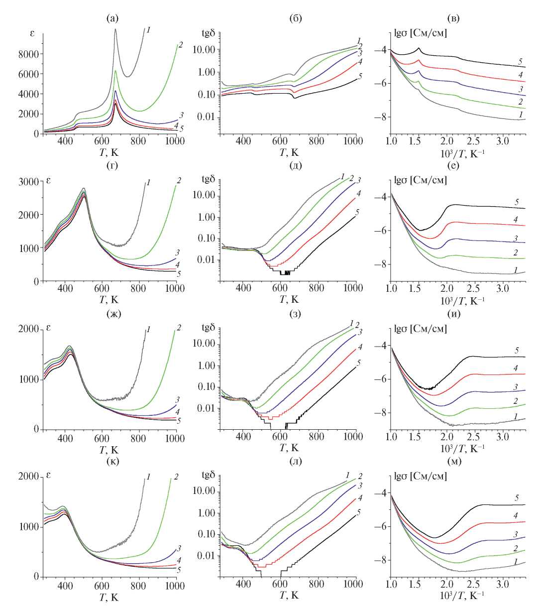 Рис. 4. Температурные зависимости диэлектрической проницаемости ε(T), диэлектрических потерь tgδ(T) и электропроводности lgσ(1/T) образцов(1−x)(K0.5Na0.5)NbO3–xSrZrO3, модифицированных ZnO, с x = 0.0 (а–в), 0.05 (г–е), 0.075 (ж–и), 0.125 (к–м), измеренные на частотах f = 1 (1), 10 (2), 100 (3), 300 кГц (4), 1 МГц (5).