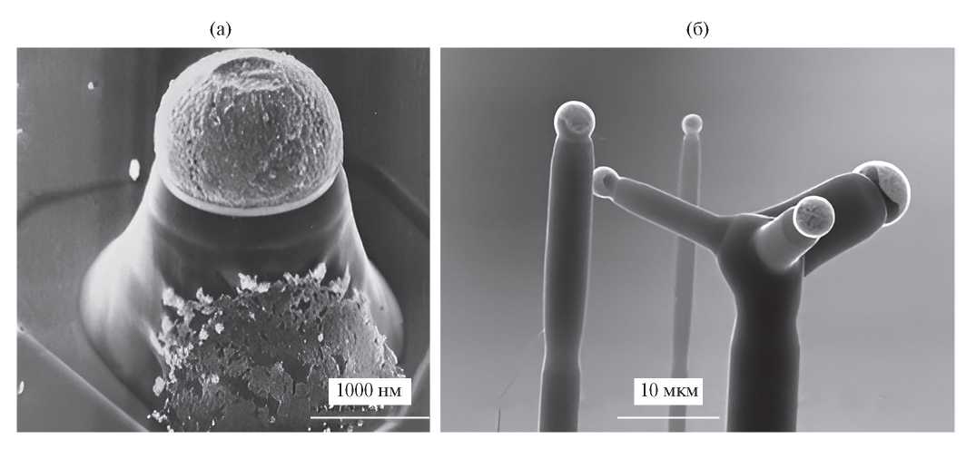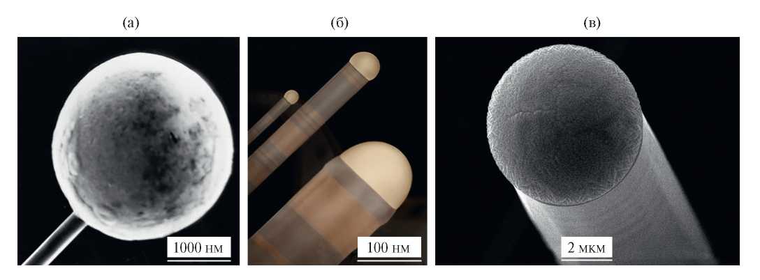Рис. 1. РЭМ-изображения вершин ННК SiC (а), GaAs [14] (б) и Si (в), иллюстрирующие практически идеальную форму усеченной сферы капель катализатора.