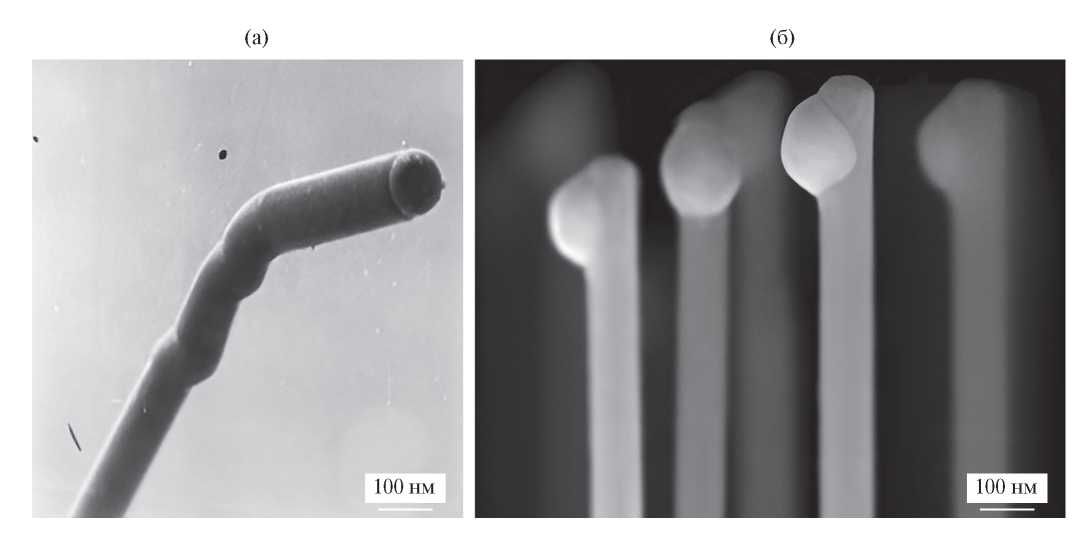 Рис. 3. Изгибание ННК Si в сторону более горячей зоны реактора при росте в условиях поперечного градиента температур (а) и сползание каталитических капель In на боковые стенки ННК InAs, выращенных на подложках GaAs{111}B при Т = 803 К, в результате послеростового отжига в течение 15 мин [6] (б).