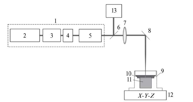 Рис. 1. Схема экспериментальной установки для обработки лазерным излучением в кювете с водой: 1 — твердотельный Nd:YAG-лазер; 2 — задающий генератор; 3 — пространственный фильтр; 4 — изолятор Фарадея; 5 — усилитель; 6, 8 — зеркала; 7 — линза; 9 — устройство для крепления образца (кювета); 10 — вода; 11 — обрабатываемый образец; 12 — двухкоординатная система перемещения; 13 — измеритель энергии импульса.