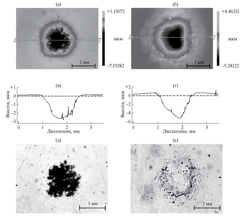 На рис. 2в, 2г представлены профили поверхности меди, из которых видно, что впадина в образце с защитным покрытием заметно глубже, чем при его отсутствии (4.75 против 2.5 мкм). На поверхности обоих образцов отсутствует бруствер, который обычно наблюдается вокруг лазерных кратеров, возникших в воздушной среде [23]. В целом, по микрофотографиям на рис. 2д, 2е можно судить о значительной деградации поверхности меди в результате воздействия лазерного облучения.