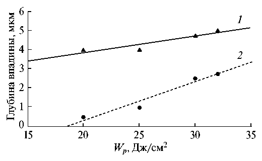 Рис. 3. Зависимости глубины впадины от плотности энергии излучения для случая с покрытием (1), без покрытия (2).