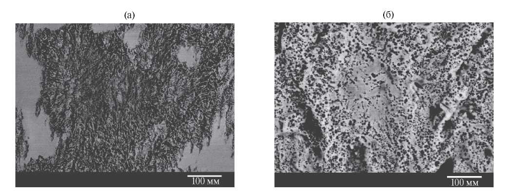 На рис. 4 представлены РЭМ-изображения пятна, полученного в результате лазерного воздействия в воде без покрытия с энергией 32 Дж/см2. Видно, что поверхность была сильно трансформирована, наблюдается застывший расплавленный материал, который выплеснулся на поверхность в результате коллапса кавитационного пузыря. Из рис. 4б видно, что в пятне, возникшем в результате лазерного воздействия в воде на поверхность меди без покрытия, образовалось большое количество пор различного размера до ~ 1.5 мкм в диаметре. В случае использования защитного поглощающего покрытия не удалось обнаружить заметного изменения морфологии поверхности.