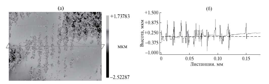 Рис. 5. Поверхность бескислородной меди без покрытия после лазерной обработки в воде с плотностью энергии 25 Дж/см2: (а) – профилограмма, (б) – профиль поверхности по отмеченной линии.