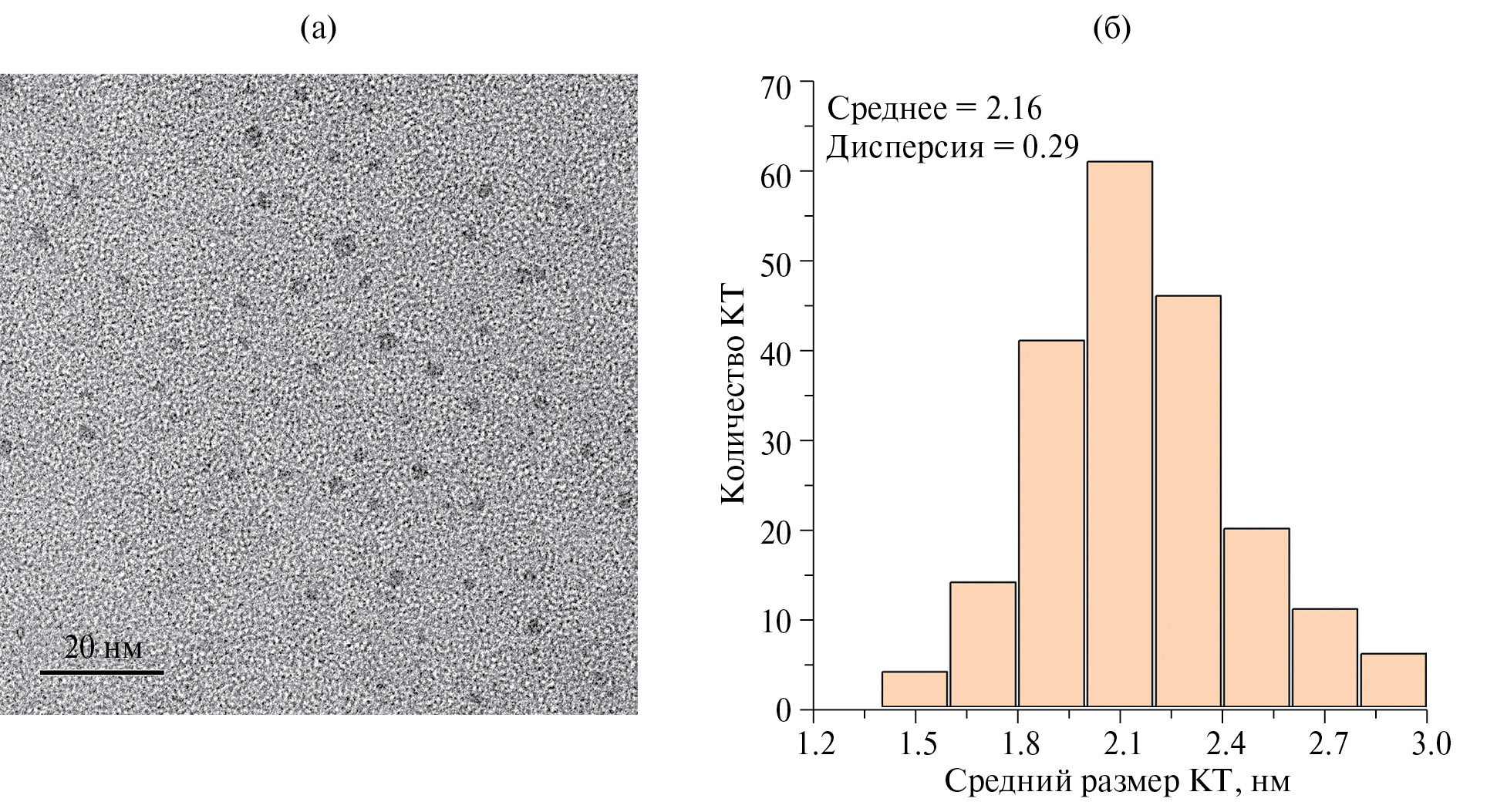 Морфологию КТ исследовали с помощью просвечивающей электронной микроскопии (ПЭМ). Использовали микроскоп JEOL JEM-2100 с ускоряющим напряжением 200 кВ. На основе ПЭМ-изображения определяли распределение КТ по размерам.