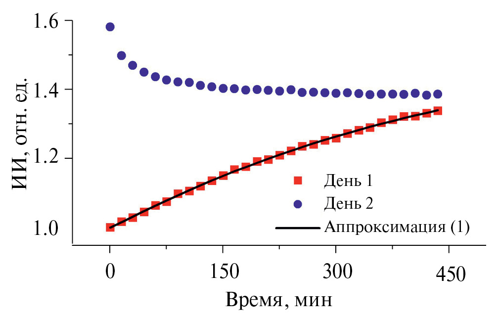 Из рис. 3 видно, что теоретическая кривая (1) достаточно хорошо согласуется с экспериментальными данными, полученными за “День 1”. Можно предположить, что при более длительном аналогичном эксперименте (порядка 20 ч) ИИ ФЛ коллоидных КТ CdTe/SiO2 увеличится на 95%. Однако, как будет показано далее, во время эксперимента “День 2” наблюдалось уменьшение ИИ со временем.
