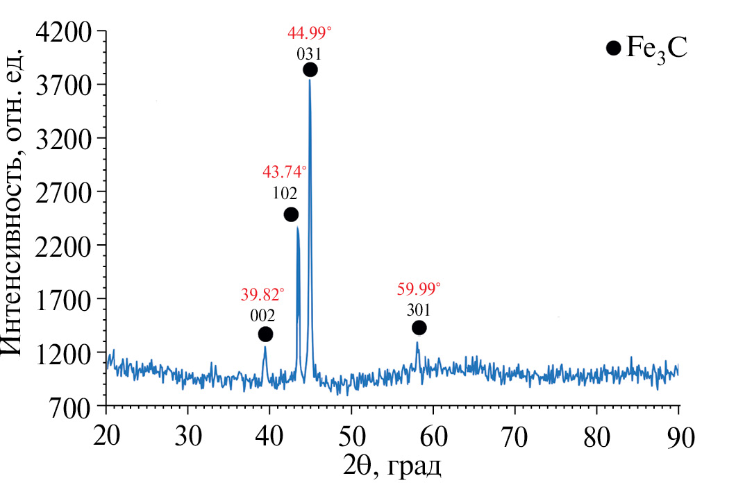 На рис. 4 представлена рентгенограмма наночастиц карбида железа, полученных методом индукционной потоковой левитации при использовании паров гексана в качестве реагента. При сравнении со стандартом карбида железа (PDF № 35-0772) наблюдаются характерные дифракционные пики Fe3C при 2θ = 39.79°, 43.76°, 44.99° и 57.99°. Они соответствуют плоскостям (002), (102), (031) и (301) орторомбической структуры (пр. гр. Pnma).