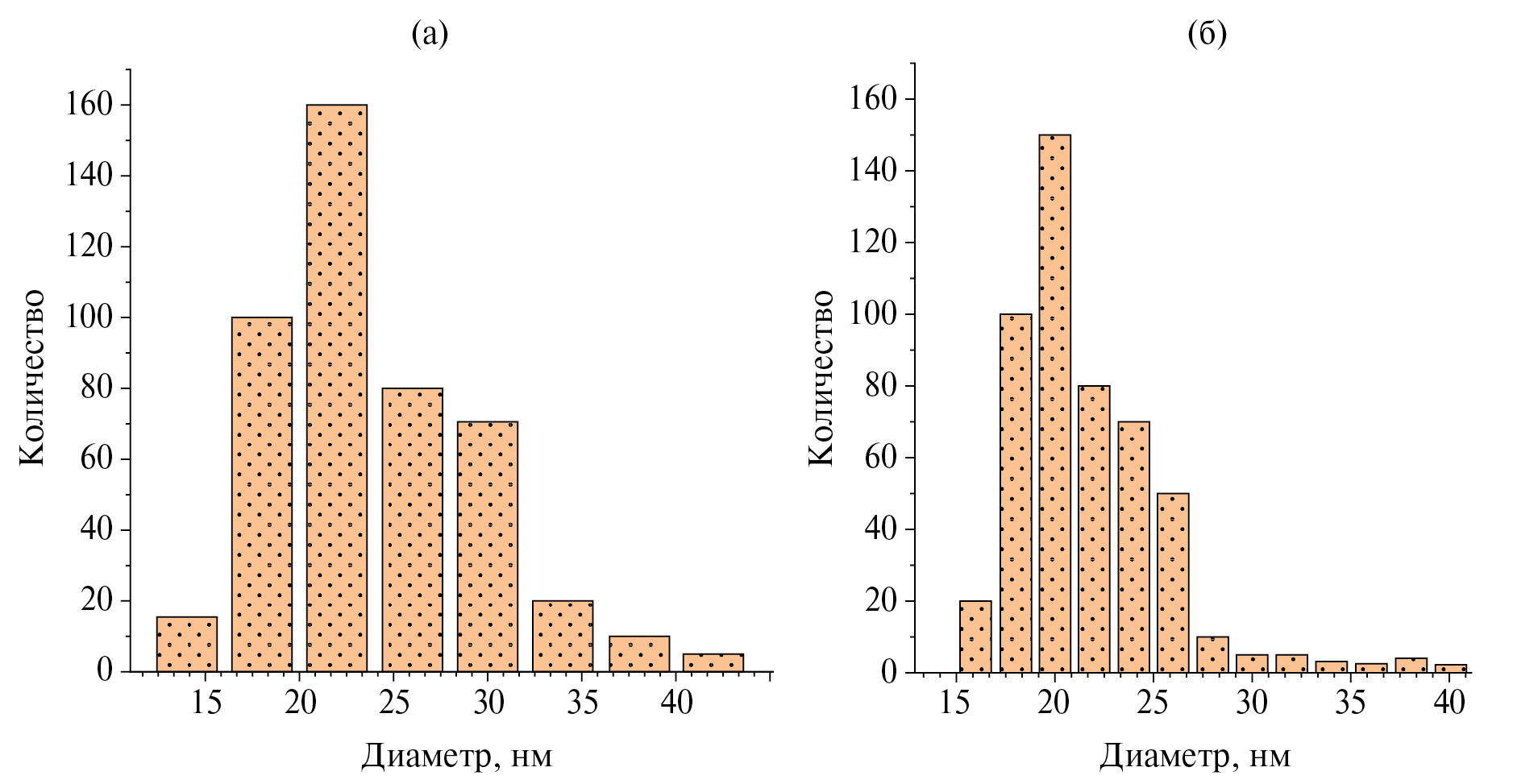 На рис. 7 представлено распределение наночастиц “ядро/оболочка” Fe@Fe3C. Анализ распределения наночастиц с усредненным удельным размером в 24 нм указывает на их монодисперсность, однако наблюдаются более крупные частицы, примерно 30 нм в диаметре.
