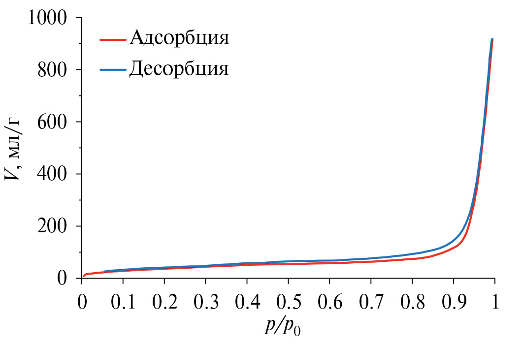 Низкотемпературная адсорбция–десорбция азота. Удельная поверхность была определена на основе изотерм адсорбции–десорбции, полученных с помощью прибора Autosorb IQ Quantachrome Instruments (США). Перед этим образцы подвергались предварительной обработке при 50°С в течение 6 ч под вакуумом 10–4 мбар для дегазации. Площадь поверхности и средний удельный размер частиц рассчитывали методами БЭТ, STSA.
