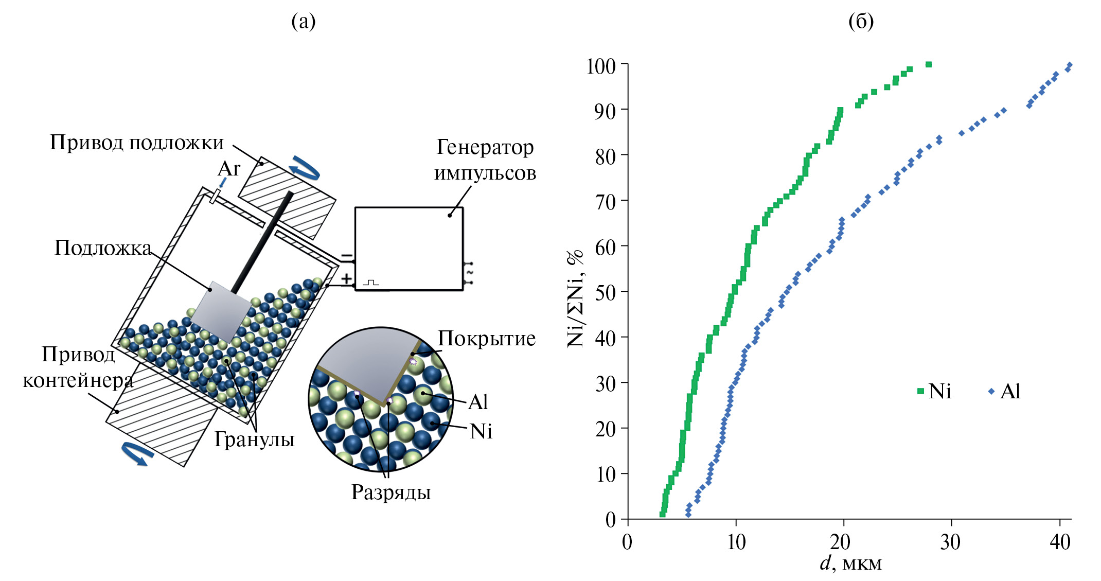 НЭ состоял из эквимолярной смеси никелевых и алюминиевых гранул c добавлением порошков никеля и алюминия в различных соотношениях (табл. 2). Рентгенофазовый анализ порошков показал, что они состоят только из фазы никеля или фазы алюминия. Средний размер частиц порошков алюминия и никеля, измеренный методом произвольных секущих по ASTME112-12, составил 18.0 ± 10.3 и 11.3 ± 6.4 мкм (рис. 1б). Гранулы изготавливали из никелевой пластины и алюминиевого круга, используя приемы токарной обработки. Гранулы имели прямоугольную и цилиндрическую формы с размером 4 ± 1 мм. Гранулы и порошок засыпались в контейнер-токопровод, в который затем погружалась подложка. В качестве подложки использовались цилиндры из стали 35 диаметром 12 мм и высотой 10 мм. Схема установки для осаждения покрытий ЭИЛНЭ приведена на рис. 1а.
