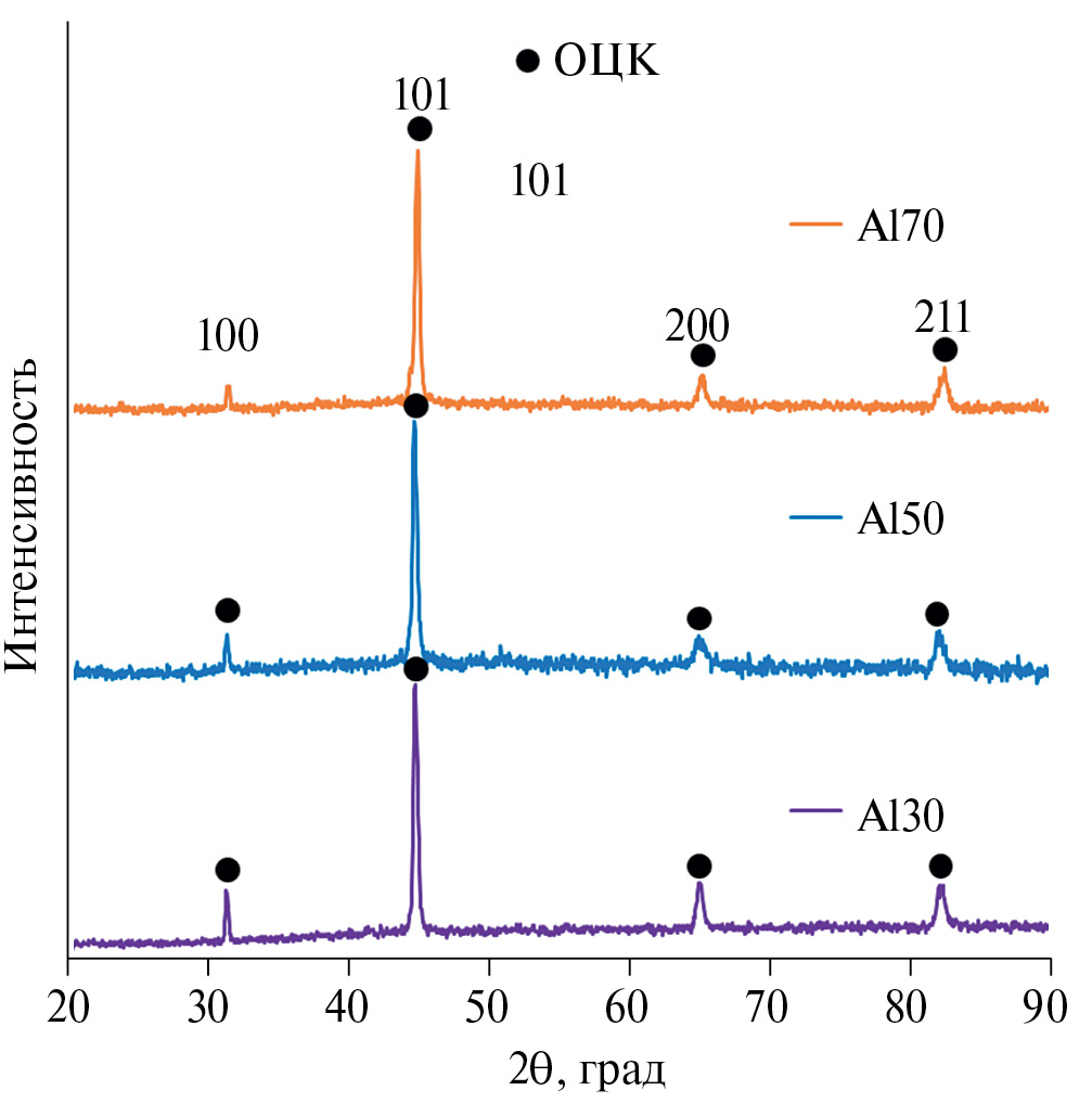 На рентгеновских спектрах всех покрытий наблюдались рефлексы объемно-центрированной кубической (ОЦК) решетки (рис. 6). Согласно проведенному анализу, ОЦК-решетка может быть представлена интерметаллидами Al0.96Ni1.04 (#44-1186), AlFe0.23Ni0.77 (#47-1126), AlFe (#33-20) и α-Fe (#6-696), рефлексы которых практически совпадают вследствие близких параметров ячейки.