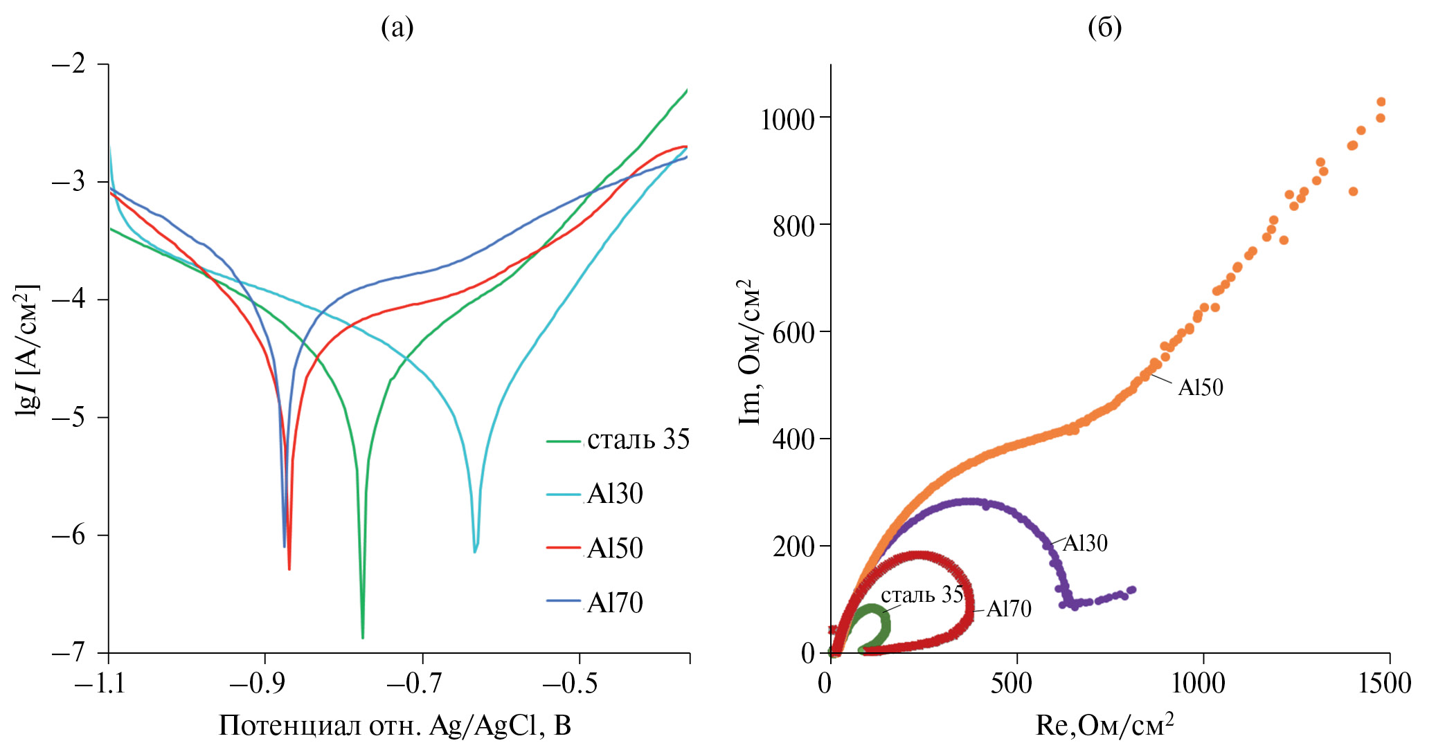 На рис. 8а показаны кривые Тафеля, построенные по результатам потенциодинамических испытаний композитных покрытий, а также исходной стали 35. Потенциал коррозии (Ecorr) и плотность тока коррозии (Icorr) определяли экстраполяцией анодных и катодных наклонов кривых Тафеля (табл. 4). Согласно полученным данным, потенциал коррозии осажденных покрытий монотонно снижался от –0.63 до –0.88 В с ростом концентрации алюминия в НЭ. Это объясняется низким стандартным электродным потенциалом алюминия (≤ –1.49 В). Коррозионная плотность тока покрытий находилась в диапазоне от 20.7 до 95.9 мкA/см2 с минимумом у образца Al30 и максимумом у Al70 (табл. 4). Плотность тока коррозии стали 35 составляла 30.7 мкA/см2. Потенциодинамическая кривая покрытия Al30 демонстрирует меньшие потенциал и ток коррозии по сравнению со сталью 35, что указывает на более высокую стойкость к коррозии. В работе [26] показано, что Al–Ni–Fe-покрытия, приготовленные методом механоактивации, демонстрируют более высокий потенциал коррозии и более низкий ток коррозии по сравнению с подложкой из низкоуглеродистой стали.