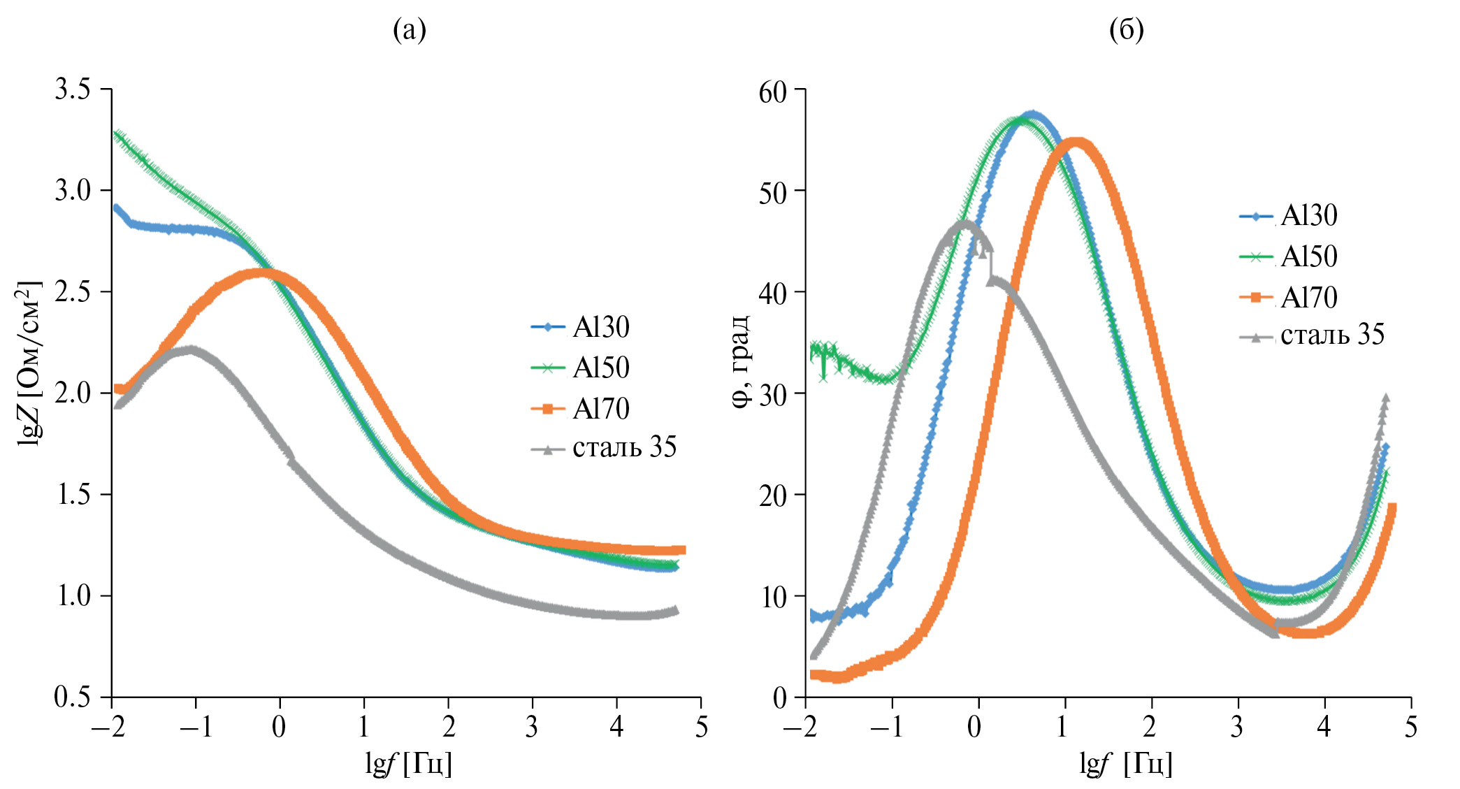 Для получения дополнительной информации о Ni–Al-покрытиях приведены диаграммы импеданса Боде (рис. 9), поскольку они дают четкое описание частотно-зависимого электрохимического поведения на поверхности материала [30]. Известно, что высокий импеданс на низких частотах отражает благородное электрохимическое поведение материала [27]. Судя по графикам Боде, модуль импеданса (lg|Z|) покрытий был выше, чем у подложки, что также свидетельствует об эффективной роли поверхностного упрочнения стали Ni–Al-покрытиями (рис. 9а). Как показано на графике импеданса, спектр в среднем диапазоне частот имеет широкую линейную область, что является характерной чертой однослойного пассивного слоя. На графике фазового угла Боде можно было наблюдать выпуклость на средних частотах с фазовым углом для покрытий выше 50° (рис. 9б). Этот диапазон частот соответствует компактности полученной оксидной пленки. Известно, что идеально плотная оксидная пленка присутствует на поверхности при значении фазового угла около 90°; она может эффективно ингибировать процессы переноса заряда [31]. Для стали 35 максимальные значения фазового угла были ниже 50°. Это свидетельствует о том, что компактность оксидной пленки, формирующейся на ней, была меньше, чем у покрытий. Ширина выпуклости фазового угла уменьшается в ряду образцов Al50, Al30 и Al70, что указывает на снижение стабильности оксидной пленки, образующейся на образцах, в данном ряду.