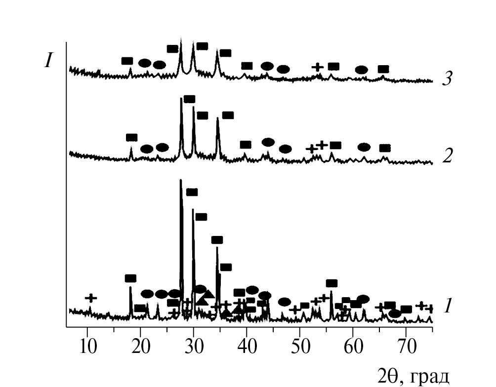 Рис. 6. Дифрактограммы продуктов измельчения, полученных при различных отношениях масс Ш : П: 1 – 5 : 1, 2 – 10 : 1, 3 – 15 : 1; время измельчения – 90 мин, скорость вращения – 700 об./мин (■ – сфен, + – эгирин, ● – нефелин, ▲ – апатит).