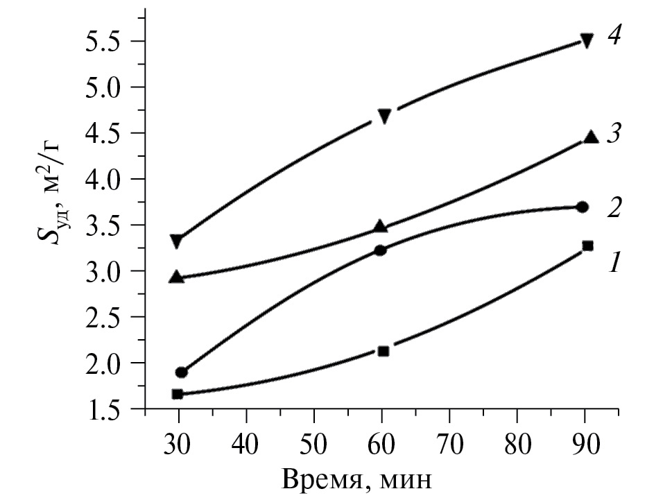 Рис. 7. Изменение удельной поверхности измельченного продукта в зависимости от отношения масс Ш : П: 1 – 5 : 1, 2 – 10 : 1, 3 – 15 : 1, 4 – 20 : 1, а также времени обработки; скорость вращения барабана – 300 об./мин.