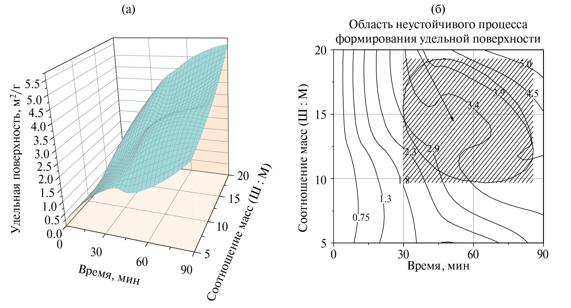 Выделенная область (заштрихована) на рис. 9 соответствует условиям измельчения минеральной смеси – 300 об./мин и 30–80 мин, не обеспечивающим формирование поверхности частиц твердой фазы со стабильной величиной удельной поверхности. Повышение энергетического воздействия на частицы за счет повышения скорости вращения барабана до 700 об./мин сопровождается понижением удельной поверхности за счет слипания частиц и их дезактивацией за счет образования агломератов.