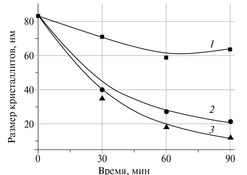 Рис. 14. Зависимости размера кристаллитов (ОКР) сфена от продолжительности измельчения при отношении масс Ш : П = 20 : 1 и скорости вращения: 1 – 300, 2 – 500, 3 – 700 об./мин.