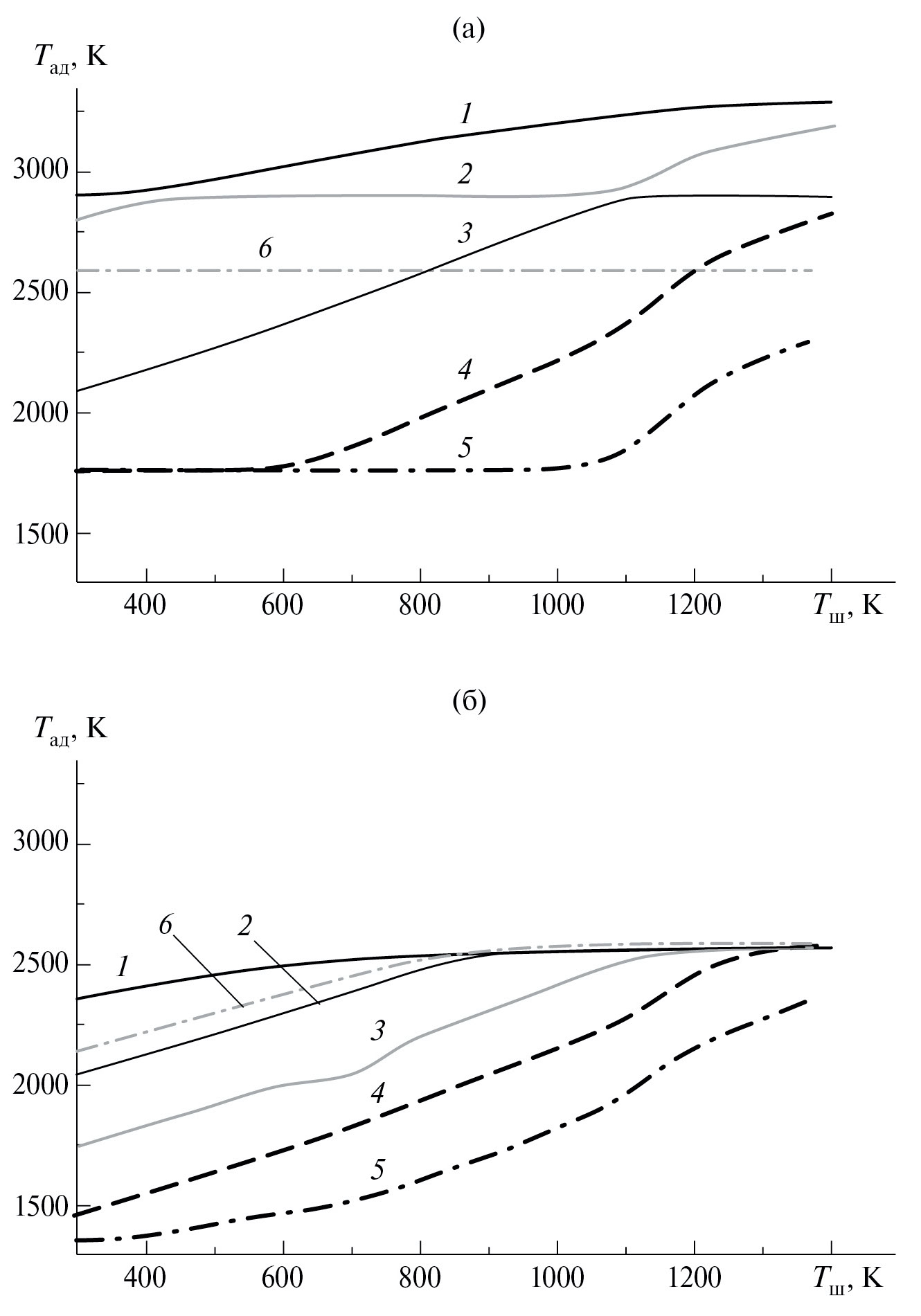 2. Fig. 1. Dependences of the adiabatic reduction temperature on the batch temperature in the Ta2O5–M (a) and Mg4Ta2O9–M (b) systems; M – Ca (1–5), Mg (6); reducing agent content: stoichiometric (1, 6), excess 25 (2), 50 (3), 75 (4), 100% (5).
