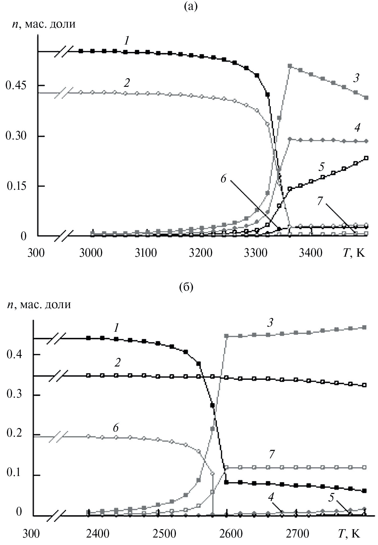 Рис. 2. Расчетные равновесные концентрации веществ (n) в системах исходных реагентов: Ta2O5–Ca (1 – Taтв,ж, 2 – CaOтв,ж, 3 – Ta2O5ж, 4 – Caг, 5 – TaO2г, 6 – TaOг, 7 – CaOг) (а); Mg4Ta2O9–Ca (1 – Taтв, 2 – CaOтв, 3 – Ta2O5ж, 4 – Caг, 5 – TaO2г, 6 – MgOтв, 7 – Mgг) (б).