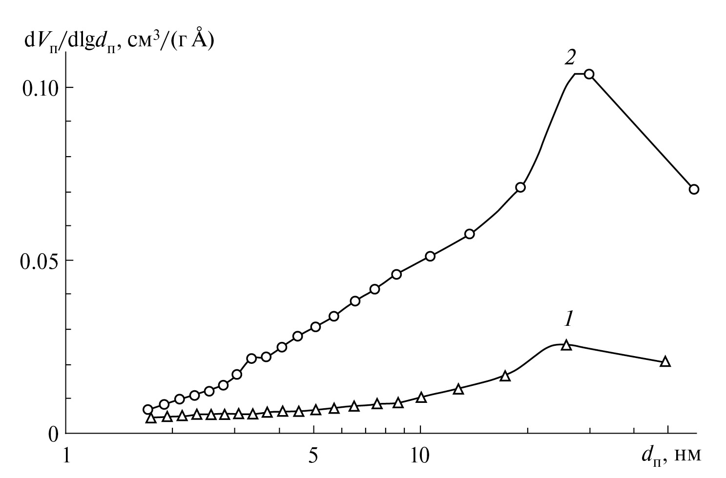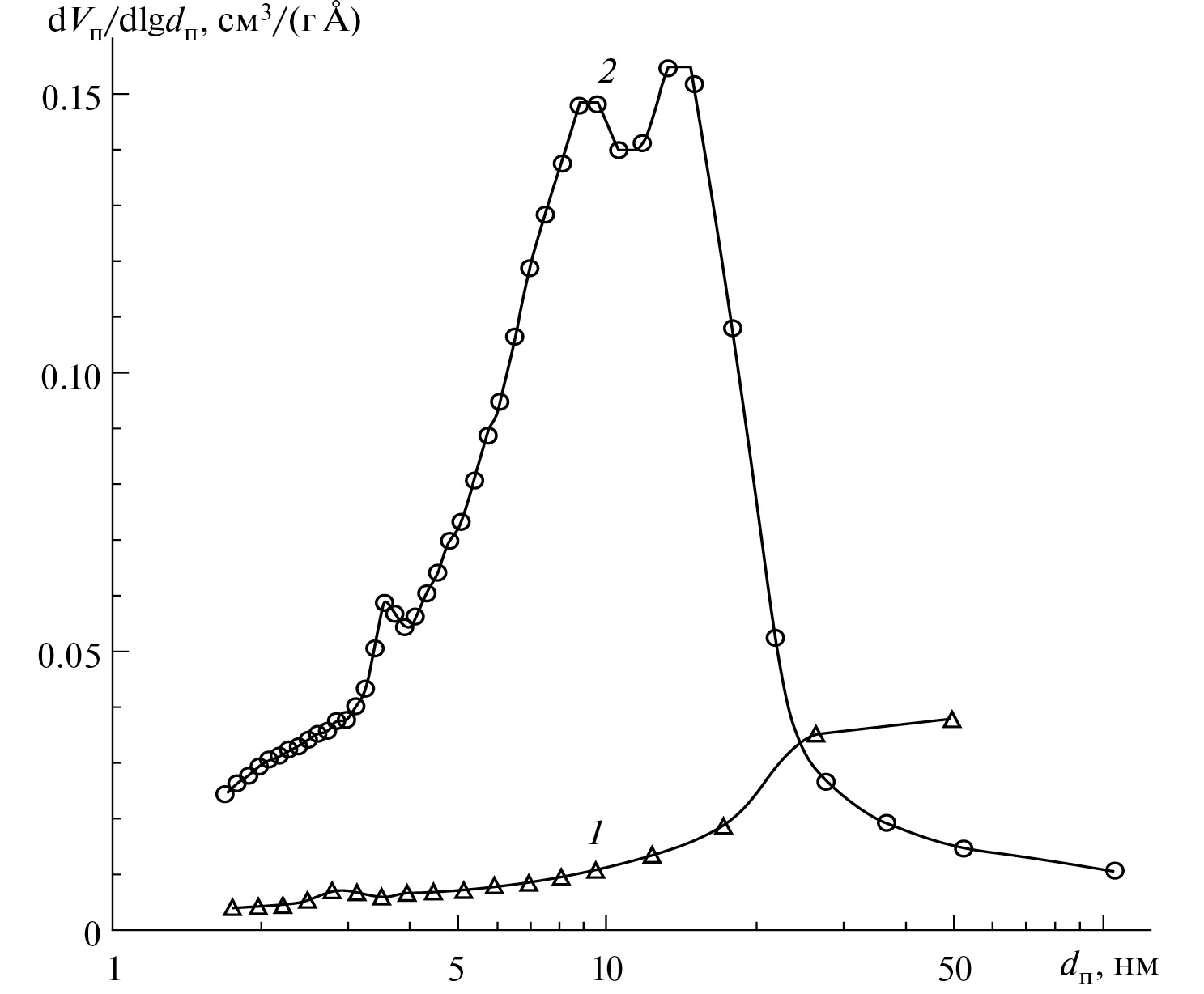 4. Fig. 3. Distribution of pore sizes in niobium powders obtained by reduction of Nb2O5 with calcium (1) [40] and magnesium (2) vapors; specific surface area of ​​powders: 9.4 (1), 30 m2/g (2).