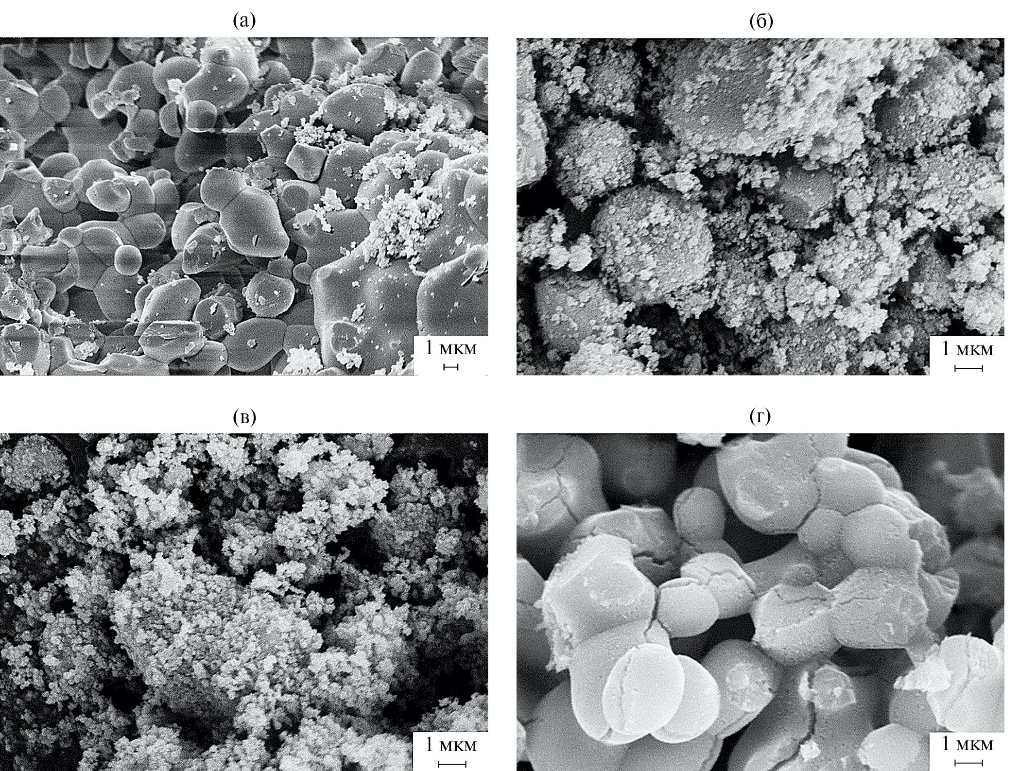 Рис. 7. СЭМ-изображения исходного порошка ниобата магния (а) и порошков ниобия, полученных его восстановлением кальцием при: 1073 K, 1 ч (б); 1123 K, 2 ч (в) и магнием при 1103 K, 4 ч (г).