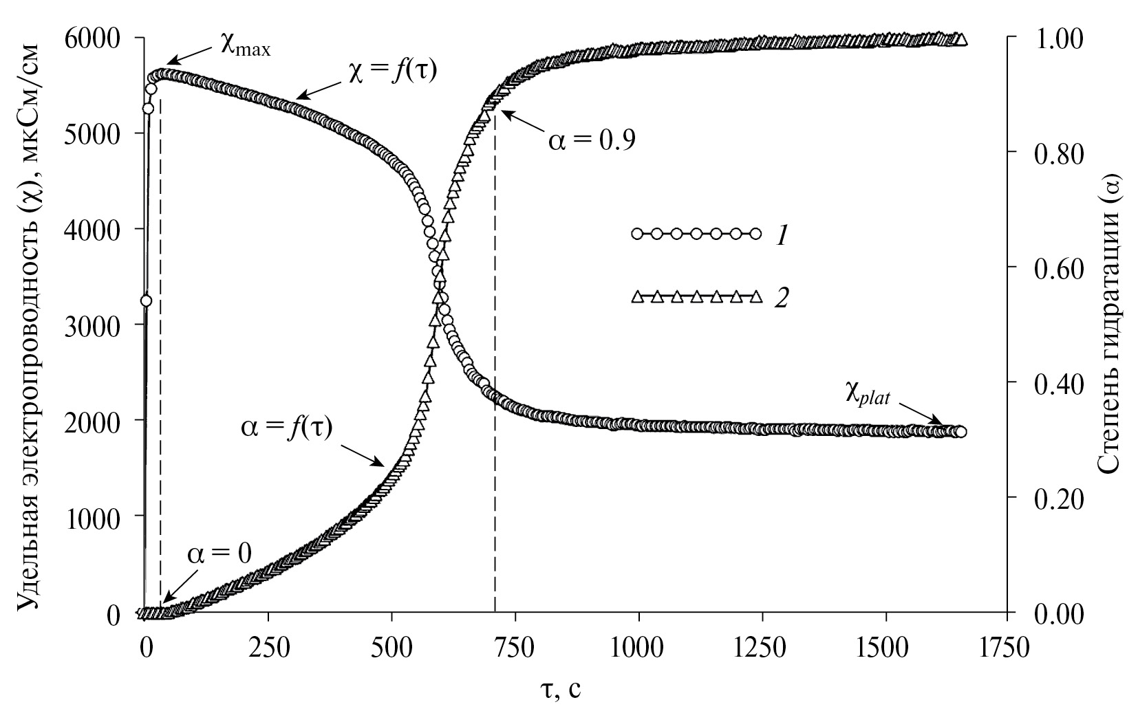 где χτ, χmax и χplat – удельная электропроводность раствора в момент времени τ, максимальное ее значение и не изменяющееся с течением времени соответственно, мкСм/см.