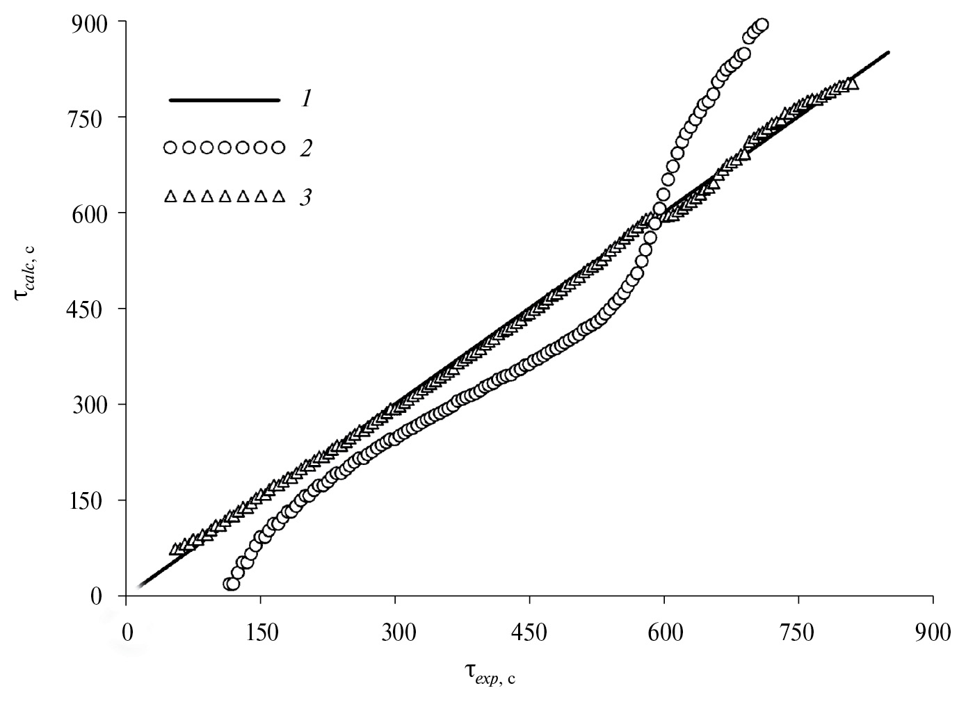 Рис. 5. Диаграмма корреляции времени τcalc = f(τexp): 1 – τcalc = τexp; 2, 3 – время, рассчитанное из выражений (16) и (17).