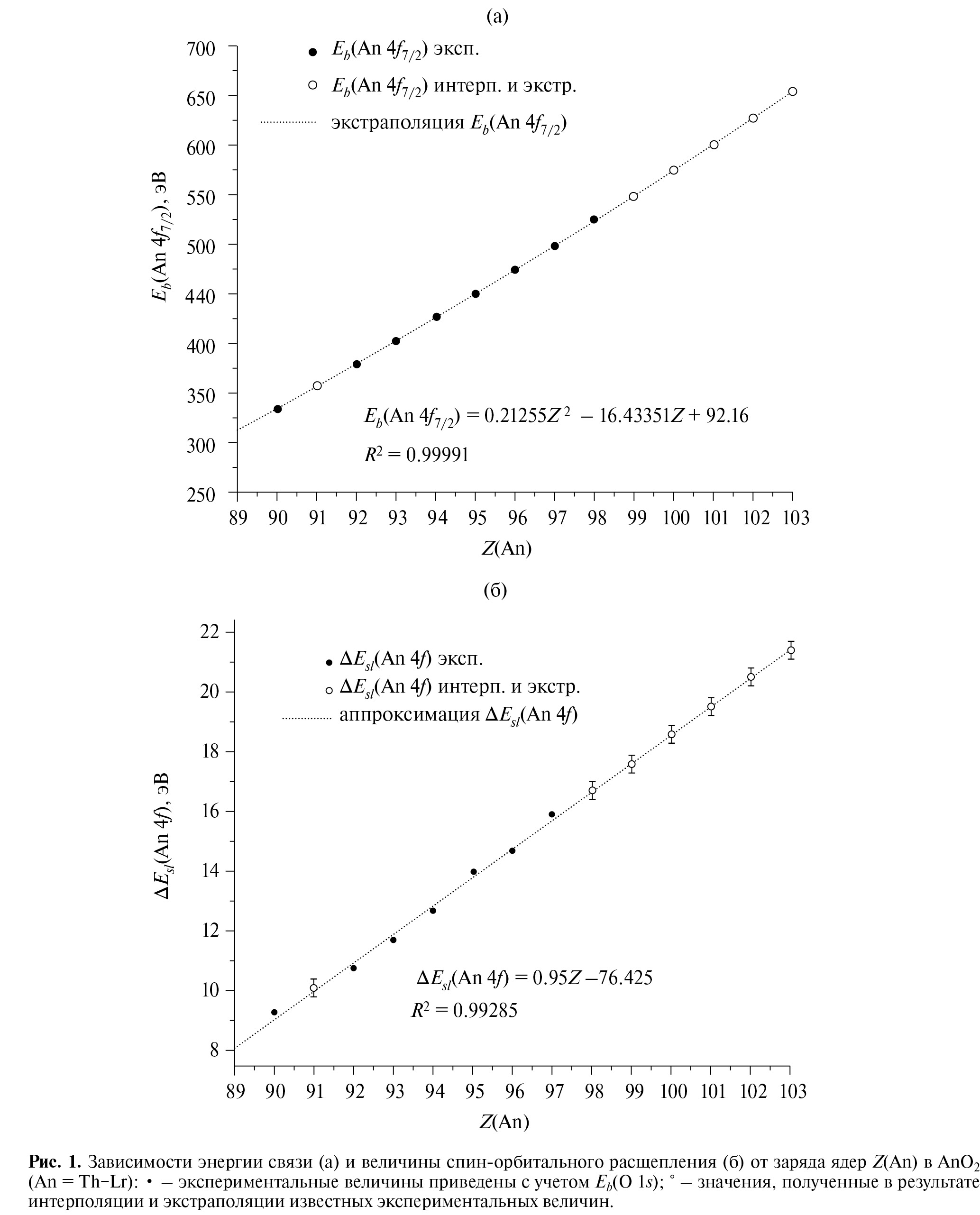 где Eb – энергия связи электронов, ΔEsl – величина спин-орбитального расщепления, Z – атомный номер актиноида, R2 = 0.99991 (коэффициент корреляции). Зависимости (1), (2) использовались при оценке Eb и ΔEsl для PaO2 и CfO2 [9].