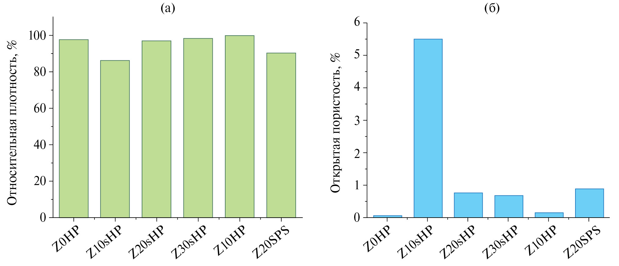 Рис. 1. Результаты определения относительной плотности (а) и открытой пористости (б).