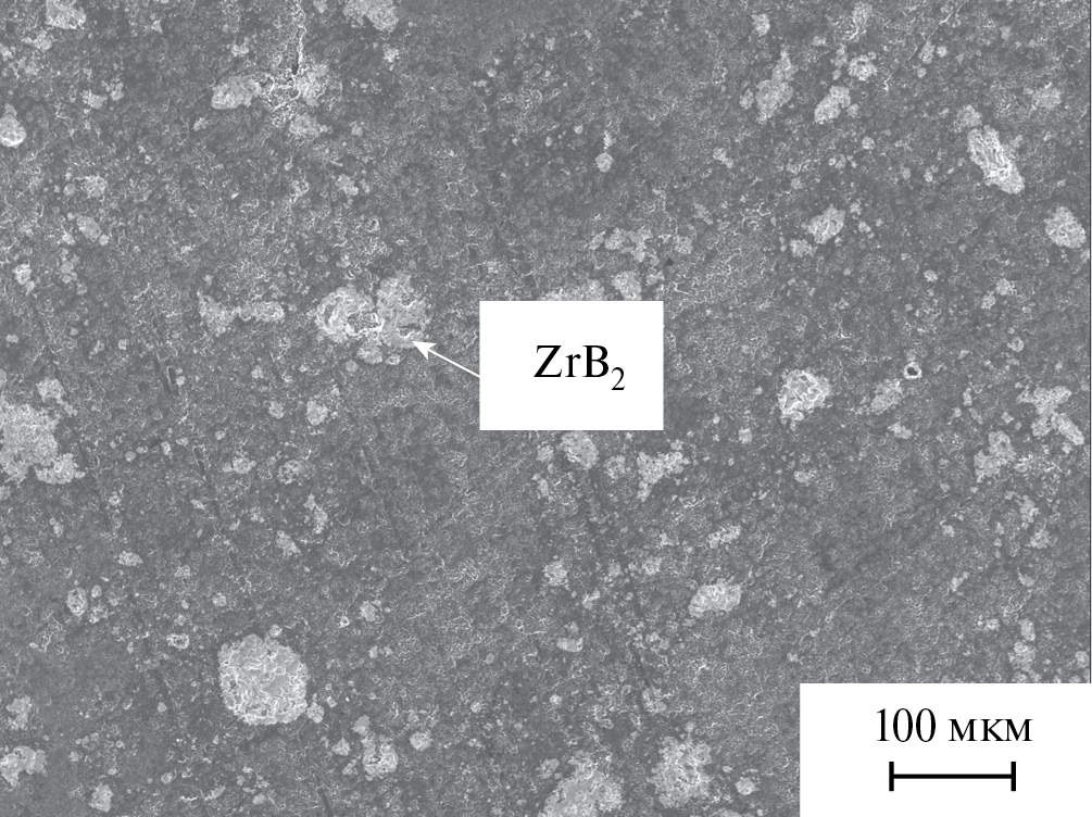 Несмотря на то что большая часть зерен фазы ZrB2 в образце, изготовленном методом реакционного ГП, имеют размер на уровне ~1.2 мкм, присутствуют и относительно крупные включения до 18 мкм. Присутствие крупных агрегатов может быть обусловлено высокой твердостью ZrO2 [27] и необходимостью более длительного измельчения шихты.