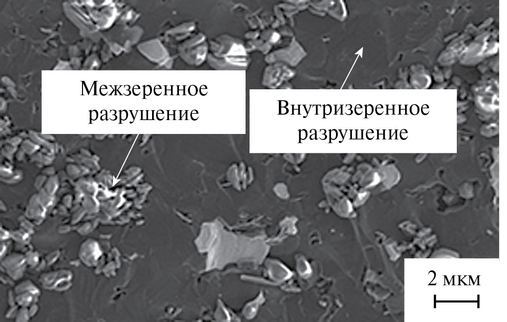 Исследование поверхности разрушения образцов керамики показало разницу в характере разрушения зерен фаз В4С и ZrB2 (рис. 7). Можно заметить, что для фазы В4С наблюдается внутризеренный характер разрушения, в то время как для фазы ZrB2 – межзеренный. Это позволяет предположить, что трещина, распространяясь в объеме основной фазы, будет менять свое направление при попадании на зерна ZrB2 и ее энергия будет постепенно затухать.
