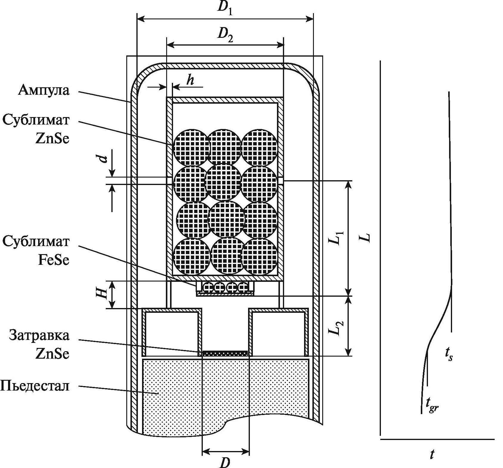 Монокристаллическая затравка ZnSe с ориентацией (111) была размещена на кварцевом пьедестале, служащие для отвода тепла от растущего кристалла. Малый зазор между стенками ампулы и кварцевого пьедестала служил для отвода легколетучих примесей в холодный конец ампулы, а также обеспечивал условие минимума давления над ростовой поверхностью. Справа схематично показан температурный градиент, в который была помещена ампула. Температура над исходными компонентами была примерно одинаковой и обозначена в дальнейшем как Ts. Температура затравки была на 40К ниже и обозначена как Tgr. Характерное время роста кристалла составляло 200–400 ч.