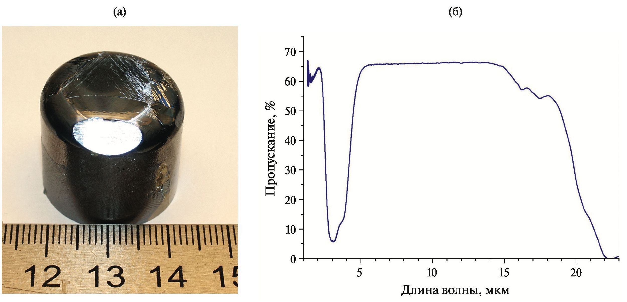 Рис. 2. Фотография одного из выращенных кристаллов Fe:ZnSe (a) и спектр пропускания одного из активных элементов лазера, изготовленного из выращенного кристалла (б).