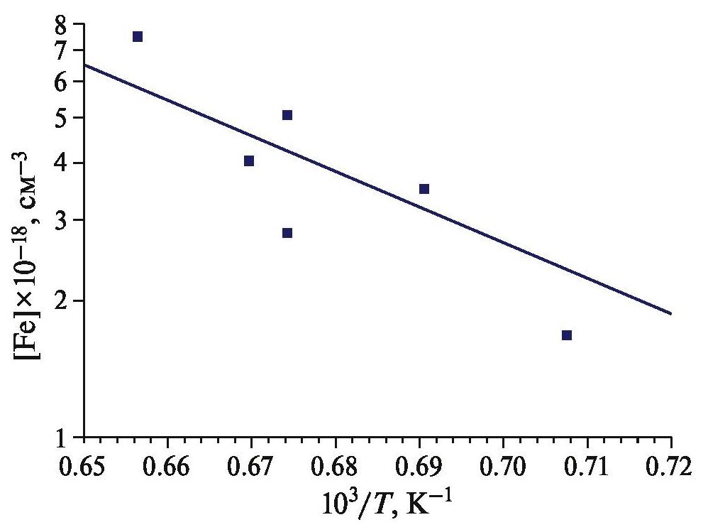 На рис. 3 представлена рассчитанная по формуле (5) кривая. Видно, что экспериментальные данные удовлетворительно описываются расчетной кривой. Это подтверждает справедливость сделанных предположений. В целом наблюдается тенденция увеличения концентрации Fe с увеличением температуры роста. В данной технологии максимальная температура ограничивается температурой размягчения кварца.