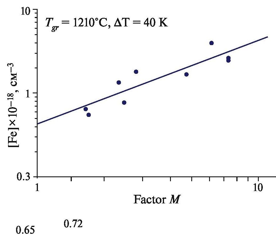 Из формулы (6) следует, что концентрация Fe может быть увеличена путем уменьшения ∆Т = Ts – Tgr. Однако при этом уменьшается различие между парциальными давлениями Zn и Se в источнике и над растущей поверхностью кристалла, что приводит к уменьшению потоков элементов и скорости роста кристалла. Другой возможностью увеличения уровня легирования является увеличение параметра М. Зависимость концентрации Fe от М представлена на рис. 4.