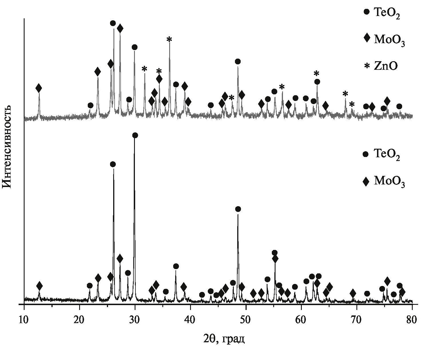 В последние десятилетия сложные оксиды теллура, молибдена и цинка находят все более широкое применение в науке и технике. Помимо исследований гептаоксида молибдена-дителлура Te2MoO7 как катализатора окисления [1, 2] и вещества, проявляющего фотокаталитическую активность [3], это соединение изучается как перспективный исходный компонент для получения двойных и многокомпонентных теллуритномолибдатных стекол [4, 5]. Гексаоксид цинка-молибдена-теллура ZnMoTeO6 является продуктом взаимодействия бинарных оксидов в тройной системе TeO2−MoO3−ZnO и наряду с Te2MoO7 способствует стеклообразованию в ней [6].