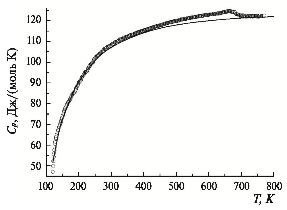 При анализе экспериментальных данных по теплоемкости в широком интервале температур необходимо учитывать ангармонический вклад, который может приводить к различию изобарной Cp и изохорной CV теплоемкостей в области высоких температур. Эту компоненту теплоемкости можно вычислить по экспериментальным данным сжимаемости (KT) и коэффициента теплового расширения (α): CpCV = Vα2T / KT, где V – молярный объем. Данные по сжимаемости PFT, насколько нам известно, в литературе отсутствуют, поэтому для вычисления ангармонического вклада в фононную теплоемкость использовали значения коэффициента теплового расширения для PFN [23] и модуля объемной сжимаемости сегнетокерамики PrZr0,5Ti0,5O3 [24], родственных PFT. Рассчитанный ангармонический вклад в фононную теплоемкость PFT при 700 К составил примерно 1.0 Дж/(моль K), т.е. менее 1% от общей теплоемкости. Поэтому, в силу малости этой величины, при дальнейшем анализе температурной зависимости фононной теплоемкости различие между Ср и СV можно не принимать во внимание. Малая величина ангармонического вклада обусловлена достаточно низким коэффициентом теплового расширения оксидной керамики.