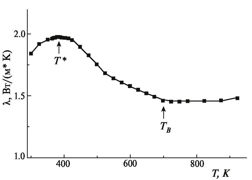 На рис. 3 и 4 приведены температурные зависимости термодиффузии η и теплопроводности λ образцов PFТ в интервале температур 290–800 К. На зависимостях η(Т) и λ(Т) наблюдается аномальное поведение в областях Т ≈ 380 К и ТB ≈ 690 К. Возможно, при T* ≈ 380 К происходит объединение нанополярных областей в более крупные и долгоживущие дипольные области, поскольку во всех известных релаксорных сегнетоэлектриках на основе Pb температура T* находится выше TС (ТB > T* > TС) в интервале 350–570 K (в ряде работ изменения при T* называют “наномасштабным фазовым переходом”) [17–19, 28].