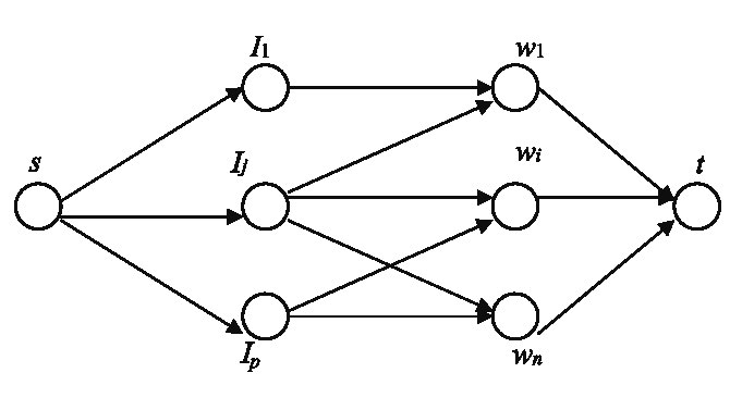 Пусть y 0 < y 1 << y p MathType@MTEF@5@5@+= feaahqart1ev3aqatCvAUfeBSjuyZL2yd9gzLbvyNv2Caerbov2D09 MBdbqedmvETj2BSbqee0evGueE0jxyaibaieYhh9frVeeu0dXdh9vq qj=hEeeu0xXdbba9frFj0=OqFfea0dXdd9vspGe9FjuP0=fs0xXdbb a9pGe9xq=Jbba9suk9fr=xfr=xfrpeWZqaaeaabiGaaiaacaqabeaa biqacmaaaOqaaabaaaaaaaaapeGaamyEa8aadaWgaaWcbaWdbiaaic daa8aabeaak8qacqGH8aapcaWG5bWdamaaBaaaleaapeGaaGymaaWd aeqaaOWdbiabgYda8iabgAci8kabgYda8iaadMhapaWaaSbaaSqaa8 qacaWGWbaapaqabaaaaa@3CB1@  — все различные величины b i ,  c i MathType@MTEF@5@5@+= feaahqart1ev3aqatCvAUfeBSjuyZL2yd9gzLbvyNv2Caerbov2D09 MBdbqedmvETj2BSbqee0evGueE0jxyaibaieYhh9frVeeu0dXdh9vq qj=hEeeu0xXdbba9frFj0=OqFfea0dXdd9vspGe9FjuP0=fs0xXdbb a9pGe9xq=Jbba9suk9fr=xfr=xfrpeWZqaaeaabiGaaiaacaqabeaa biqacmaaaOqaaabaaaaaaaaapeGaamOya8aadaWgaaWcbaWdbiaadM gaa8aabeaak8qacaGGSaGaaqoOaiaadogapaWaaSbaaSqaa8qacaWG Pbaapaqabaaaaa@3820@ , i= 1, n ¯ MathType@MTEF@5@5@+= feaahqart1ev3aqatCvAUfeBSjuyZL2yd9gzLbvyNv2Caerbov2D09 MBdbqedmvETj2BSbqee0evGueE0jxyaibaieYhh9frVeeu0dXdh9vq qj=hEeeu0xXdbba9frFj0=OqFfea0dXdd9vspGe9FjuP0=fs0xXdbb a9pGe9xq=Jbba9suk9fr=xfr=xfrpeWZqaaeaabiGaaiaacaqabeaa biqacmaaaOqaaabaaaaaaaaapeGaamyAaiabg2da98aadaqdaaqaa8 qacaaIXaGaaiilaiaaKdkacaWGUbaaaaaa@3779@ , I j = y j1 ,  y j , MathType@MTEF@5@5@+= feaahqart1ev3aqatCvAUfeBSjuyZL2yd9gzLbvyNv2Caerbov2D09 MBdbqedmvETj2BSbqee0evGueE0jxyaibaieYhh9frVeeu0dXdh9vq qj=hEeeu0xXdbba9frFj0=OqFfea0dXdd9vspGe9FjuP0=fs0xXdbb a9pGe9xq=Jbba9suk9fr=xfr=xfrpeWZqaaeaabiGaaiaacaqabeaa biqacmaaaOqaaabaaaaaaaaapeGaamysa8aadaWgaaWcbaWdbiaadQ gaa8aabeaak8qacqGH9aqpdaWadaWdaeaapeGaamyEa8aadaWgaaWc baWdbiaadQgacqGHsislcaaIXaaapaqabaGcpeGaaiilaiaaKdkaca WG5bWdamaaBaaaleaapeGaamOAaaWdaeqaaaGcpeGaay5waiaaw2fa aiaacYcaaaa@4009@   δ j = y j y j1 , MathType@MTEF@5@5@+= feaahqart1ev3aqatCvAUfeBSjuyZL2yd9gzLbvyNv2Caerbov2D09 MBdbqedmvETj2BSbqee0evGueE0jxyaibaieYhh9frVeeu0dXdh9vq qj=hEeeu0xXdbba9frFj0=OqFfea0dXdd9vspGe9FjuP0=fs0xXdbb a9pGe9xq=Jbba9suk9fr=xfr=xfrpeWZqaaeaabiGaaiaacaqabeaa biqacmaaaOqaaabaaaaaaaaapeGaeqiTdq2damaaBaaaleaapeGaam OAaaWdaeqaaOWdbiabg2da9iaadMhapaWaaSbaaSqaa8qacaWGQbaa paqabaGcpeGaeyOeI0IaamyEa8aadaWgaaWcbaWdbiaadQgacqGHsi slcaaIXaaapaqabaGcpeGaaiilaaaa@3D86@   j= 1, p ¯ MathType@MTEF@5@5@+= feaahqart1ev3aqatCvAUfeBSjuyZL2yd9gzLbvyNv2Caerbov2D09 MBdbqedmvETj2BSbqee0evGueE0jxyaibaieYhh9frVeeu0dXdh9vq qj=hEeeu0xXdbba9frFj0=OqFfea0dXdd9vspGe9FjuP0=fs0xXdbb a9pGe9xq=Jbba9suk9fr=xfr=xfrpeWZqaaeaabiGaaiaacaqabeaa biqacmaaaOqaaabaaaaaaaaapeGaamOAaiabg2da98aadaqdaaqaa8 qacaaIXaGaaiilaiaaKdkacaWGWbaaaaaa@377C@ . Строится потоковая сеть G= V, A MathType@MTEF@5@5@+= feaahqart1ev3aqatCvAUfeBSjuyZL2yd9gzLbvyNv2Caerbov2D09 MBdbqedmvETj2BSbqee0evGueE0jxyaibaieYhh9frVeeu0dXdh9vq qj=hEeeu0xXdbba9frFj0=OqFfea0dXdd9vspGe9FjuP0=fs0xXdbb a9pGe9xq=Jbba9suk9fr=xfr=xfrpeWZqaaeaabiGaaiaacaqabeaa biqacmaaaOqaaabaaaaaaaaapeGaam4raiabg2da9maabmaapaqaa8 qacaWGwbGaaiilaiaaKdkacaWGbbaacaGLOaGaayzkaaaaaa@38C2@  (см. рисунок), где V= u,  I j ,  w i ,  v   MathType@MTEF@5@5@+= feaahqart1ev3aqatCvAUfeBSjuyZL2yd9gzLbvyNv2Caerbov2D09 MBdbqedmvETj2BSbqee0evGueE0jxyaibaieYhh9frVeeu0dXdh9vq qj=hEeeu0xXdbba9frFj0=OqFfea0dXdd9vspGe9FjuP0=fs0xXdbb a9pGe9xq=Jbba9suk9fr=xfr=xfrpeWZqaaeaabiGaaiaacaqabeaa biqacmaaaOqaaabaaaaaaaaapeGaamOvaiabg2da9maacmaapaqaa8 qacaWG1bGaaiilaiaaKdkacaWGjbWdamaaBaaaleaapeGaamOAaaWd aeqaaOWdbiaacYcacaa5GcGaam4Da8aadaWgaaWcbaWdbiaadMgaa8 aabeaak8qacaGGSaGaaqoOaiaaKdkacaWG2baacaGL7bGaayzFaaGa aqoOaaaa@45D4@  —множество вершин, u — источник, v — сток, A={ u,  I j ,   I j ,  w i ,  MathType@MTEF@5@5@+= feaahqart1ev3aqatCvAUfeBSjuyZL2yd9gzLbvyNv2Caerbov2D09 MBdbqedmvETj2BSbqee0evGueE0jxyaibaieYhh9frVeeu0dXdh9vq qj=hEeeu0xXdbba9frFj0=OqFfea0dXdd9vspGe9FjuP0=fs0xXdbb a9pGe9xq=Jbba9suk9fr=xfr=xfrpeWZqaaeaabiGaaiaacaqabeaa biqacmaaaOqaaabaaaaaaaaapeGaamyqaiabg2da9iaacUhadaqada WdaeaapeGaamyDaiaacYcacaa5GcGaamysa8aadaWgaaWcbaWdbiaa dQgaa8aabeaaaOWdbiaawIcacaGLPaaacaGGSaGaaqoOaiaaKdkada qadaWdaeaapeGaamysa8aadaWgaaWcbaWdbiaadQgaa8aabeaak8qa caGGSaGaaqoOaiaadEhapaWaaSbaaSqaa8qacaWGPbaapaqabaaak8 qacaGLOaGaayzkaaGaaiilaiaaKdkaaaa@49A4@  ( w i , v)} MathType@MTEF@5@5@+= feaahqart1ev3aqatCvAUfeBSjuyZL2yd9gzLbvyNv2Caerbov2D09 MBdbqedmvETj2BSbqee0evGueE0jxyaibaieYhh9frVeeu0dXdh9vq qj=hEeeu0xXdbba9frFj0=OqFfea0dXdd9vspGe9FjuP0=fs0xXdbb a9pGe9xq=Jbba9suk9fr=xfr=xfrpeWZqaaeaabiGaaiaacaqabeaa biqacmaaaOqaaabaaaaaaaaapeGaam4Da8aadaWgaaWcbaWdbiaadM gaa8aabeaak8qacaGGSaGaaqoOaiaadAhacaGGPaGaaiyFaaaa@38AE@  — множество ориентированных дуг. Дуга I j ,  w i MathType@MTEF@5@5@+= feaahqart1ev3aqatCvAUfeBSjuyZL2yd9gzLbvyNv2Caerbov2D09 MBdbqedmvETj2BSbqee0evGueE0jxyaibaieYhh9frVeeu0dXdh9vq qj=hEeeu0xXdbba9frFj0=OqFfea0dXdd9vspGe9FjuP0=fs0xXdbb a9pGe9xq=Jbba9suk9fr=xfr=xfrpeWZqaaeaabiGaaiaacaqabeaa biqacmaaaOqaaabaaaaaaaaapeWaaeWaa8aabaWdbiaadMeapaWaaS baaSqaa8qacaWGQbaapaqabaGcpeGaaiilaiaaKdkacaWG3bWdamaa BaaaleaapeGaamyAaaWdaeqaaaGcpeGaayjkaiaawMcaaaaa@39DE@  вводится в сеть, если I j b i ,  c i MathType@MTEF@5@5@+= feaahqart1ev3aqatCvAUfeBSjuyZL2yd9gzLbvyNv2Caerbov2D09 MBdbqedmvETj2BSbqee0evGueE0jxyaibaieYhh9frVeeu0dXdh9vq qj=hEeeu0xXdbba9frFj0=OqFfea0dXdd9vspGe9FjuP0=fs0xXdbb a9pGe9xq=Jbba9suk9fr=xfr=xfrpeWZqaaeaabiGaaiaacaqabeaa biqacmaaaOqaaabaaaaaaaaapeGaamysa8aadaWgaaWcbaWdbiaadQ gaa8aabeaakiabgIGio=qadaWadaWdaeaapeGaamOya8aadaWgaaWc baWdbiaadMgaa8aabeaak8qacaGGSaGaaqoOaiaadogapaWaaSbaaS qaa8qacaWGPbaapaqabaaak8qacaGLBbGaayzxaaaaaa@3E00@ . Отметим, что при всех j и i либо I j b i ,  c i MathType@MTEF@5@5@+= feaahqart1ev3aqatCvAUfeBSjuyZL2yd9gzLbvyNv2Caerbov2D09 MBdbqedmvETj2BSbqee0evGueE0jxyaibaieYhh9frVeeu0dXdh9vq qj=hEeeu0xXdbba9frFj0=OqFfea0dXdd9vspGe9FjuP0=fs0xXdbb a9pGe9xq=Jbba9suk9fr=xfr=xfrpeWZqaaeaabiGaaiaacaqabeaa biqacmaaaOqaaabaaaaaaaaapeGaamysa8aadaWgaaWcbaWdbiaadQ gaa8aabeaakiabgIGio=qadaWadaWdaeaapeGaamOya8aadaWgaaWc baWdbiaadMgaa8aabeaak8qac