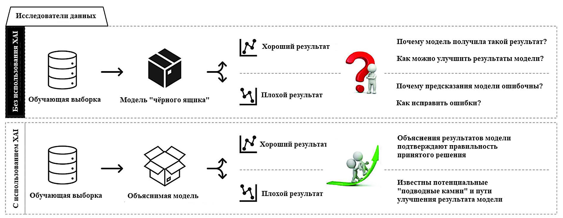 Так, для создателей систем поддержки принятия решений важно понимать, как модель получает те или иные результаты для улучшения ее характеристик и разработки новых алгоритмов. Нередко плохой результата после обучения модели тормозит процесс ее создания, так как нет понимания, почему это произошло. Возникает вопрос о наличии ошибок в реализации модели, приводящих к ухудшению результата. Учитывая многоэтапность создания модели, для поиска ошибок необходимо будет пройти все этапы построения модели и обучения заново. Использование методов ОИИ позволяет избежать необходимости пересмотра этапов создания модели за счет выявления ключевых признаков, сыгравших роль в предсказании результата (рис. 2).