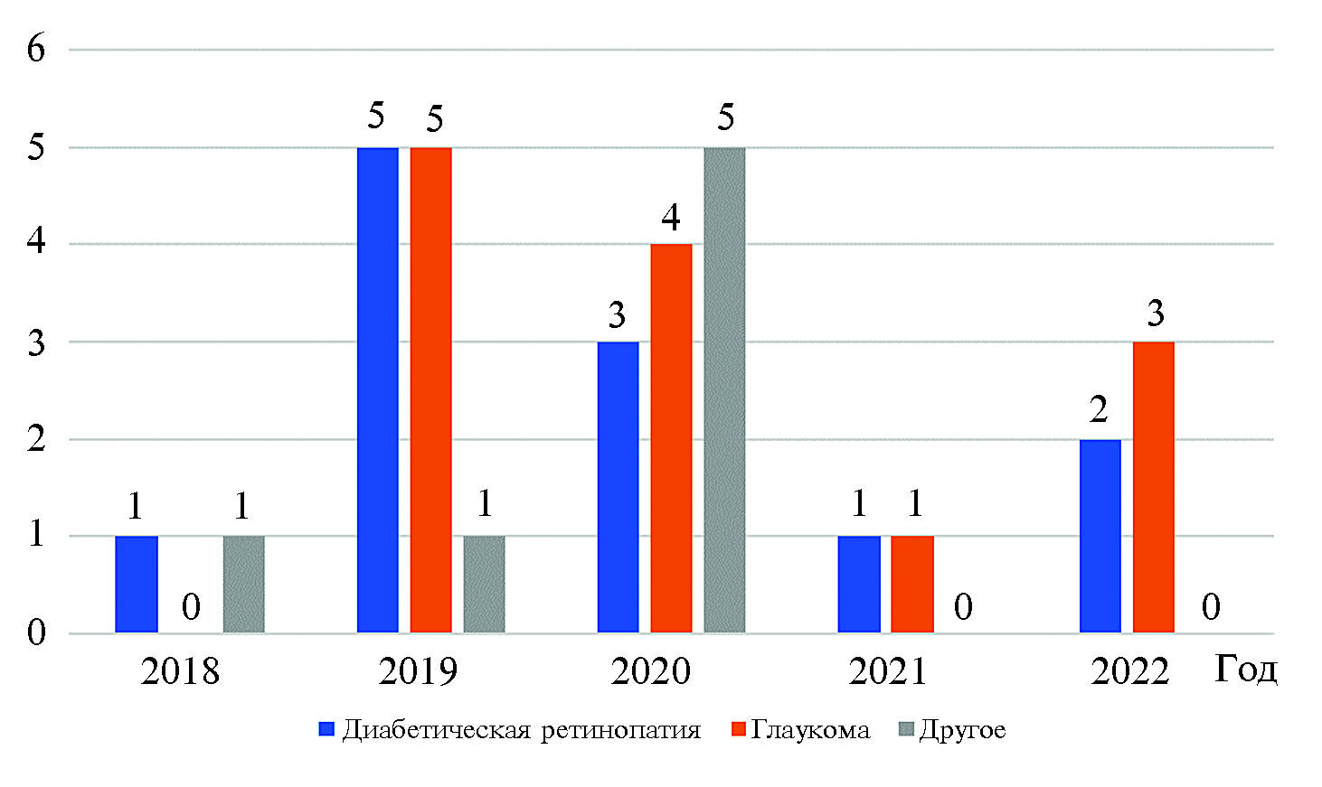 Рис. 5. Количество публикаций по годам с разбиением на глазные заболевания
