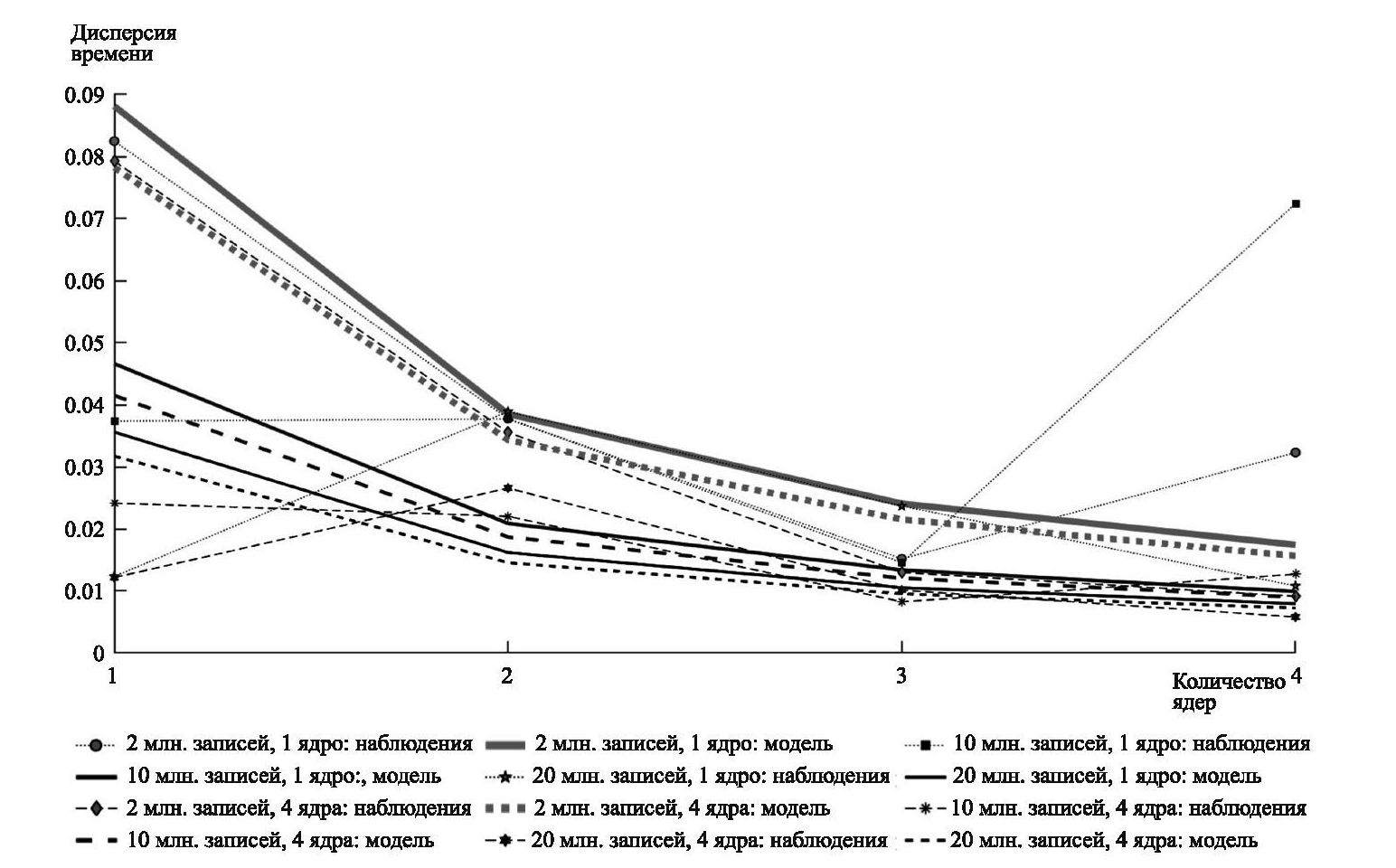 На рис. 9 представлена зависимость среднего времени выполнения задания от числа процессорных ядер при фиксированном объеме ОЗУ 4 Гб для разных фиксированных объемов заданий. На рисунке ломаными с маркерами показаны результаты нагрузочного тестирования, кривыми – построенная модель. Зависимость дисперсии имеет идентичный характер и на отдельный рисунок не вынесена.