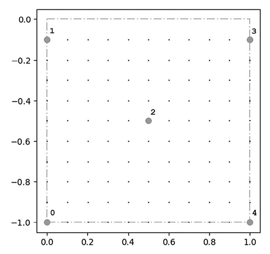 - Моделирование поиска размещения пунктов ТИС. Моделирование проводилось для ТИС из пяти измерительных пунктов. Начальное расположение пунктов представлено на рис.1, , . Использовались функции глобальной полезности (1.1) и (1.4) и рабочие области и . Отметим, что для рабочей области и функции глобальной полезности (1.1) начальное положение пунктов оказывает существенное влияние на итоговое решение, полученное алгоритмами , и . Например, начальное положение пунктов в верхней части области размещения приводит к решению, соответствующему локальному максимуму. Критерий, основанный на угле между пеленгами, на позициях, близких к рабочей области (верхняя часть области размещения), принимает значения, близкие к максимальным, а критерий, базирующийся на расстояниях между пунктами из текущего положения, не может компенсировать его влияние. При использовании рабочей области применение алгоритмов и также не дает стабильного решения. В процессе перемещения возникают такие размещения пунктов, на которых функция глобальной полезности (1.1) имеет локальный максимум и на дальнейших итерациях ни один из пунктов не изменяет своего положения, поскольку любое перемещение уменьшает значение индивидуальной полезности (1.2). Следовательно, группа агентов достигает равновесного состояния, но достигнутое равновесие не всегда обеспечивает максимум функции глобальной полезности. Применение алгоритма для позволяет получить стабильное решение, на котором функция полезности достигает глобального максимума. При этом алгоритму требуется 25 итераций на поиск решения, а итоговое размещение представлено на рис. 5. Отметим, что в итоговом решении пункты размещены на максимально возможном расстоянии друг от друга. Учитывая это наблюдение, рассмотрим вариант функции глобальной полезности (1.4). При использовании рабочей области и функции глобальной полезности (1.4) алгоритмы , также не обеспечивают стабильного решения, а применение алгоритма позволяет получить решение, на котором (1.4) достигает глобального максимума вне зависимости от начального положения пунктов. Использование алгоритма для рабочей области с помощью функции (1.4) также обеспечивает решение, на котором полезность достигает глобального максимума. При этом алгоритму требуется 20 итераций на поиск решения. Траектории движения пунктов ТИС в процессе поиска решения представлены на рис. 6. Отметим, что достижение глобального максимума функций (1.1) и (1.4) на рабочей области обеспечивается размещением, приведенным на рис. 5. Это же размещение является решением задачи с функцией полезности (1.4) и рабочей областью , а размещение, обеспечивающее достижение глобального максимума (1.1) для рабочей области , близко к вышеуказанному размещению (пункты 0 и 4 имеют ординату 0.9). Таким образом, решение, найденное алгоритмом при помощи функции (1.4) для рабочей области , может быть использовано в качестве начального приближения положения пунктов при решении задачи с функцией глобальной полезности (1.1).