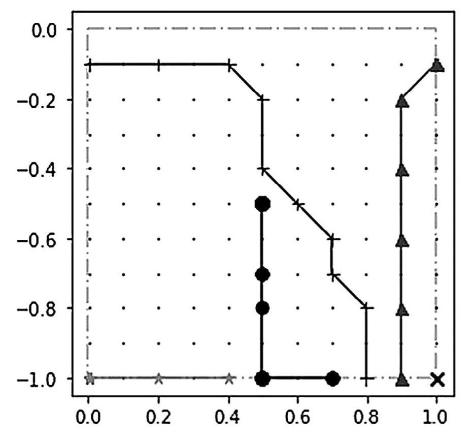 - Поиск размещения пунктов ТИС. Пусть – измерительные пункты ТИС, где , . Рабочая область – это регион, в котором ожидаем появление целей. Задача состоит в поиске размещения пунктов ТИС, при котором будет обеспечено корректное наблюдение целей, расположенных в рабочей области. Используя обозначения из [21], определим игру , где – множество игроков (агентов), – множество совместных действий агентов, причем – множество действий, доступных i-му агенту, – множество функций полезности, где – функция полезности i-го агента. Вектор – коллективные действия агентов (пунктов наблюдения), будем писать , где , где – действие i-го пункта, а – действия остальных пунктов, исключая i-й. Задача решается в дискретном варианте, для этого покрываем области размещения пунктов и целей сеткой: – узлы сетки на P, – узлы сетки на S. Набор действий (позиций для перемещения), доступных i-му агенту в момент времени t, зависит от его текущей позиции и выбирается из некоторой ее окрестности. Радиус окрестности определяется константой , которая характеризует возможности перемещения агента за один шаг игры. При этом , т.е. агент может выбрать действие, в результате которого он останется в текущей позиции. Например, на рис.1 маркером отмечены доступные позиции для перемещения агента №1 для параметра .