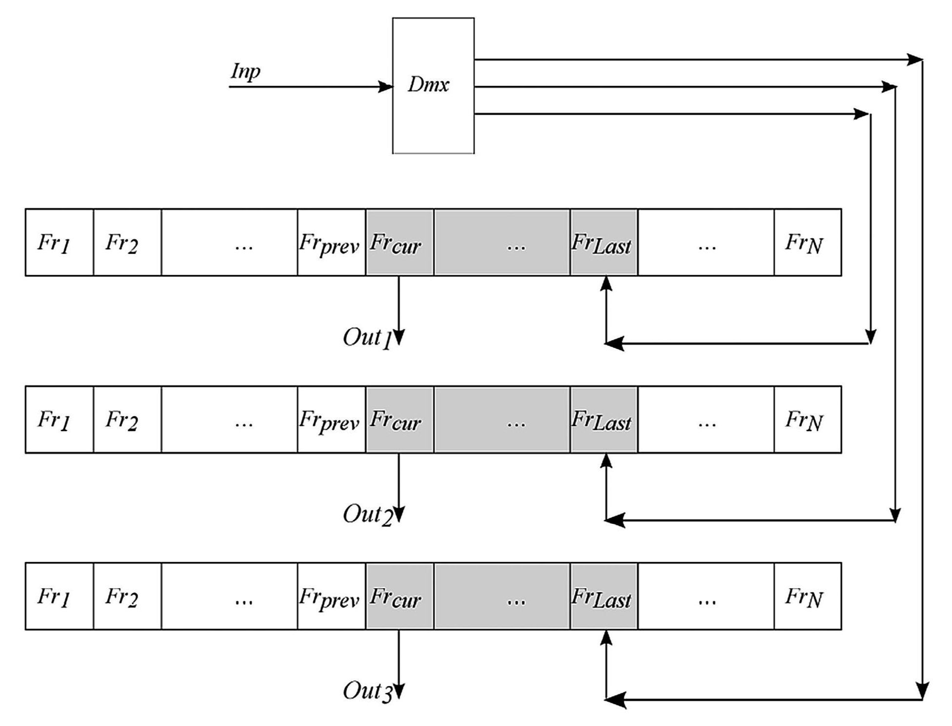 Буфер является кольцевым: по достижении конца буфера следующие кадры записываются в массивы с наименьшими номерами. Таким образом, следующий за FrN кадр будет записан в массив Fr1 (рис. 1). Здесь FrLast — последний по времени записанный кадр, FrCur — последний считанный, FrPrev — предыдущий считанный.