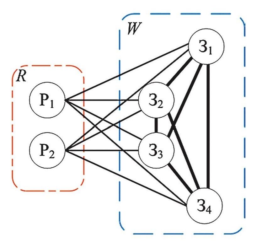 Представим в виде графа дискретное рабочее поле с расположенными на нем объектами. Пусть A – множество неориентированных ребер, R и W – вершины, соответствующие координатам расположения роботов и заданий на рабочем поле. Введем обозначения: – смешанный граф, где – объединение непересекающихся множеств. При этом никакие две вершины подмножества R не смежны друг с другом, в графе G подграф W имеет пару различных смежных вершин, а каждое ребро является взвешенным направленным ребром.