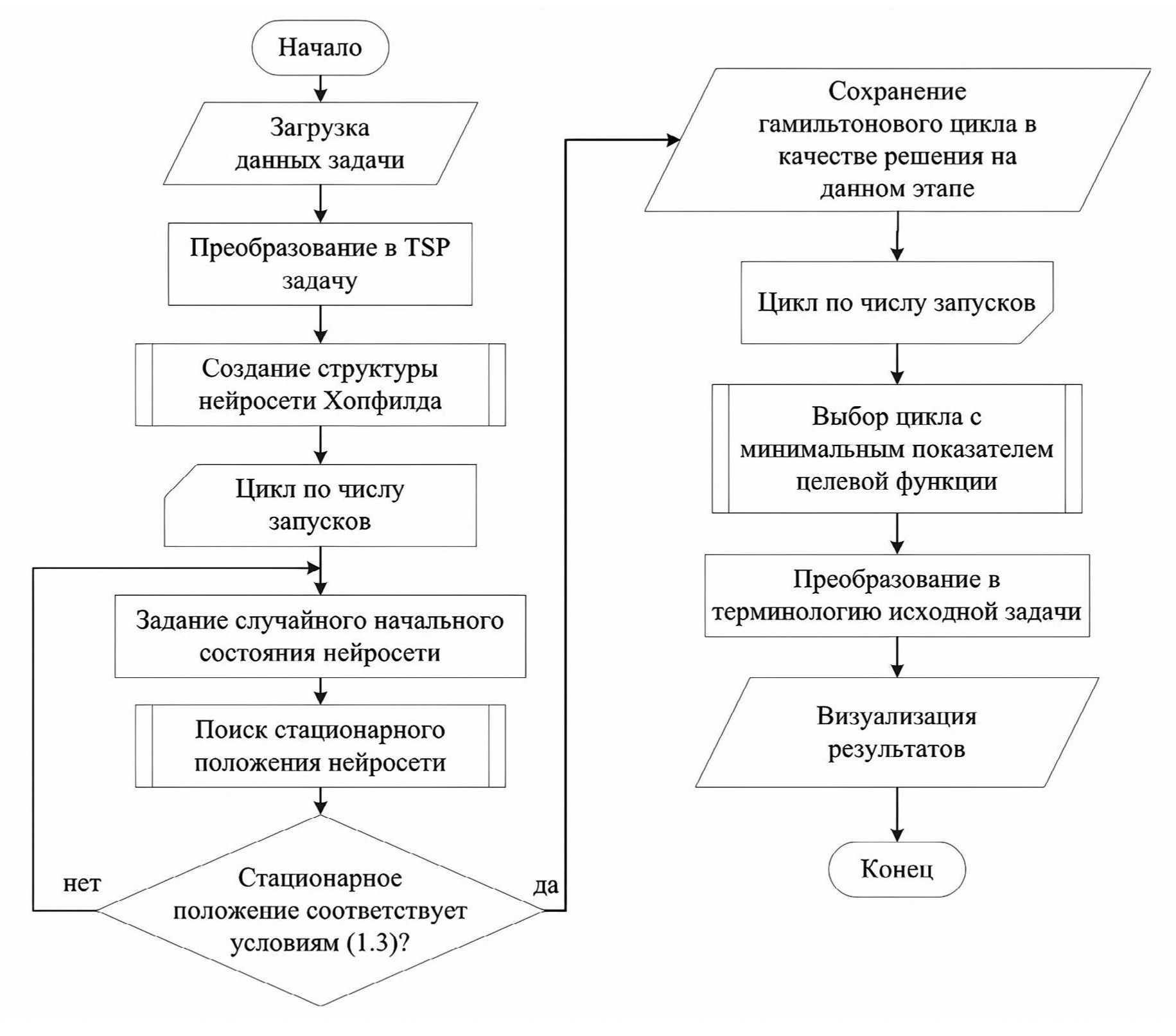 - Использование сети Хопфилда для решения задачи. Нейронная сеть Хопфилда может быть применена в целочисленном программировании и комбинаторной оптимизации [19]. Основная проблема в этом случае состоит в подборе весов в функциях активации, обеспечивающих достижение состояния сходимости и исключение неверных решений. Функцией оптимизации модели Хопфилда является функционал энергии сети [20]: