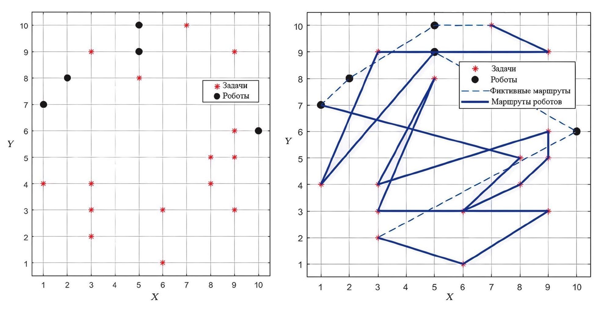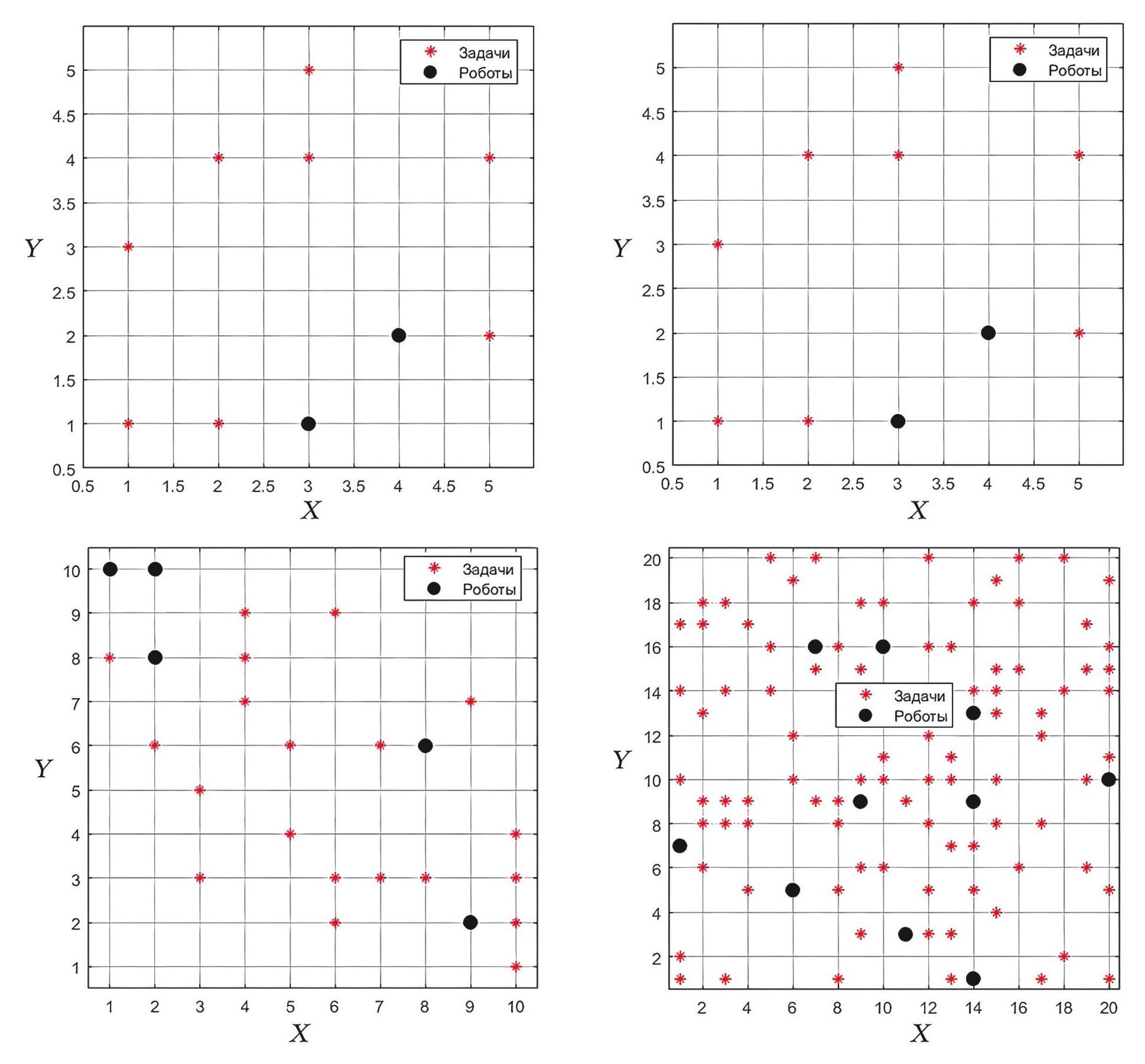 Рис. 1. Графическое представление расположения роботов и задач на рабочем поле