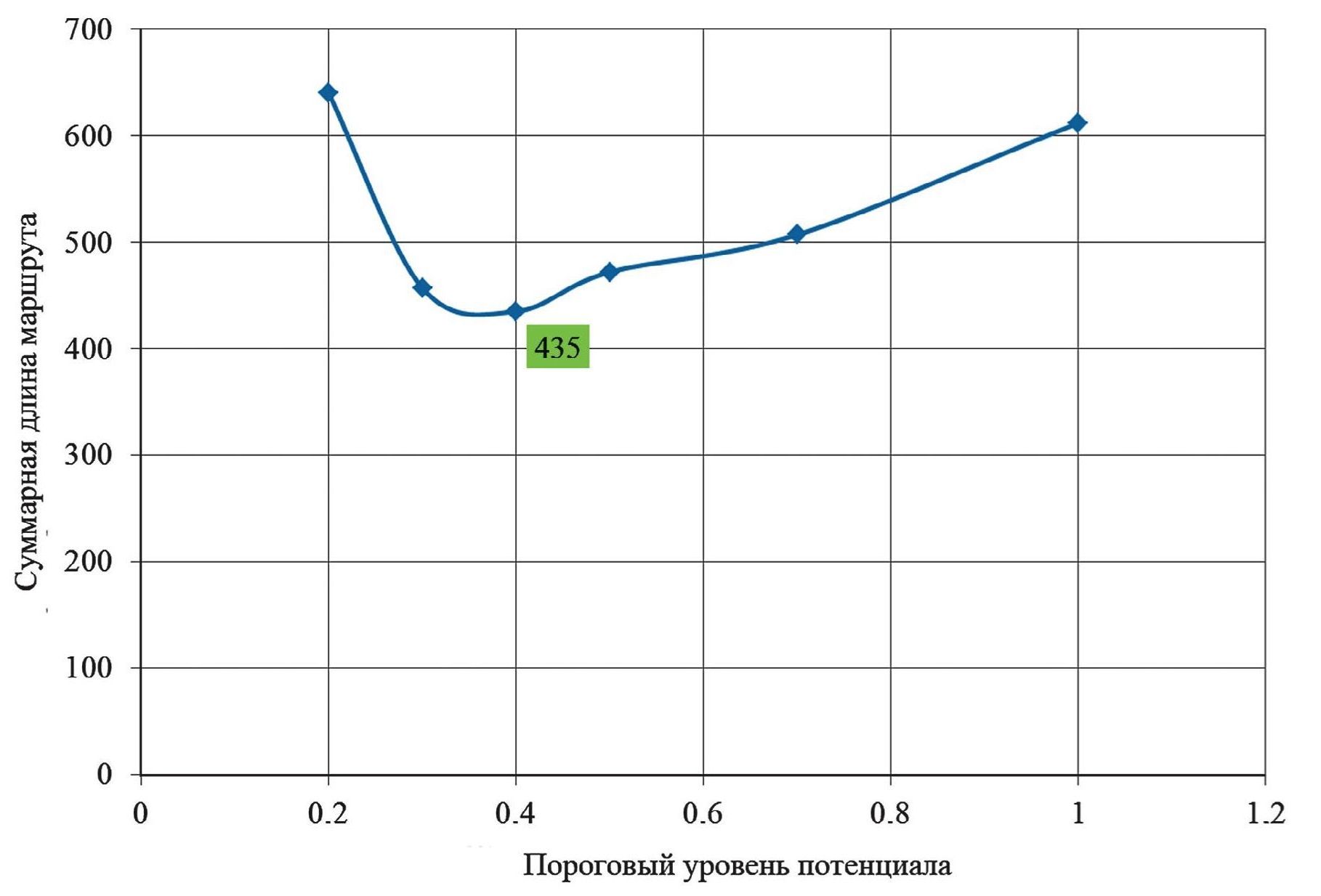Рис. 6. Зависимость минимальной длины маршрута от порогового уровня потенциала (250 запусков нейросети для каждой точки)
