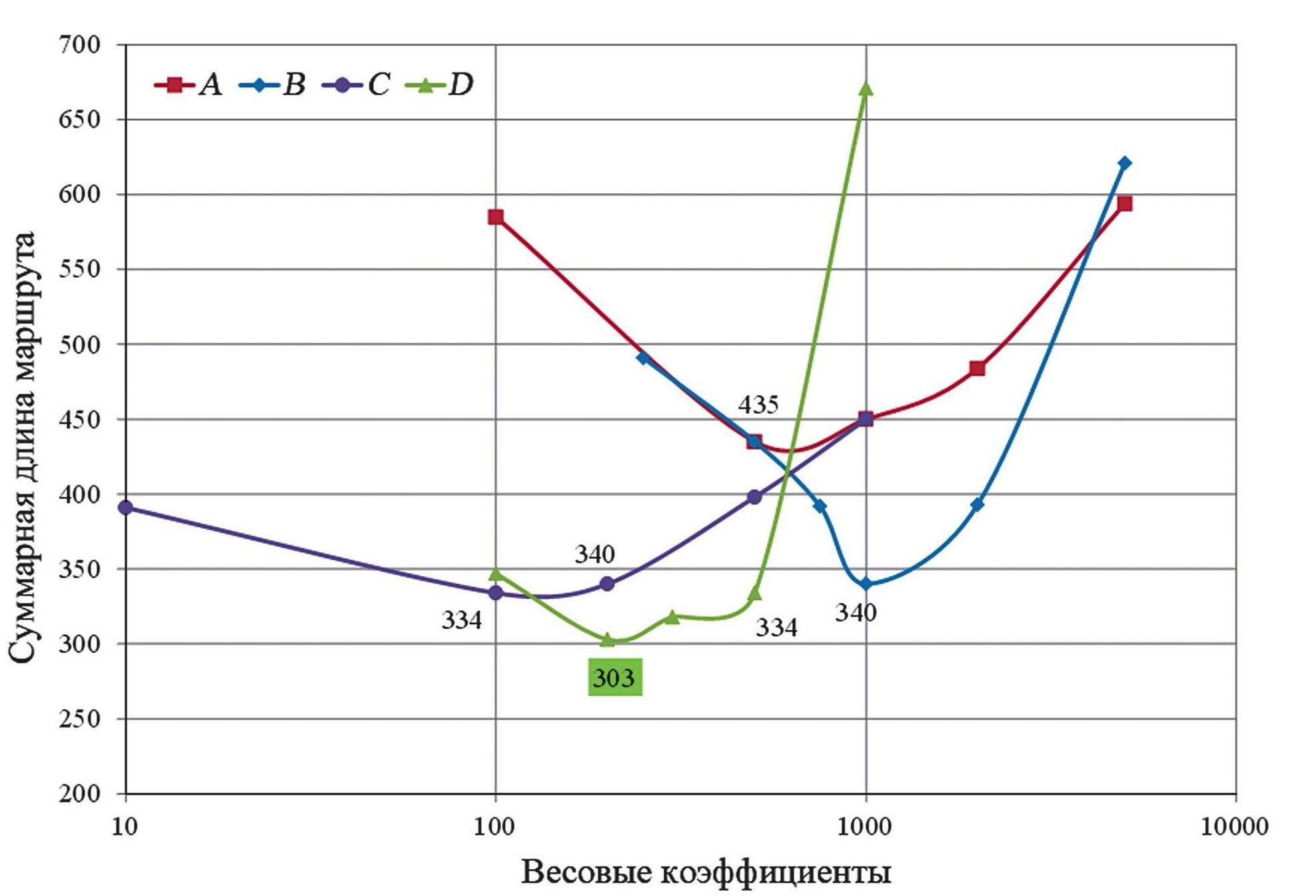 Результатом оптимизации являются следующие значения параметров: A = 500, B = 1000, C = 100, D = 200, которые позволяют получить длину маршрута в 303 единицы расстояния, что в 1.43 раза меньше исходной длины. Результат расчета задачи после второго этапа метаоптимизации показан на рис. 8.